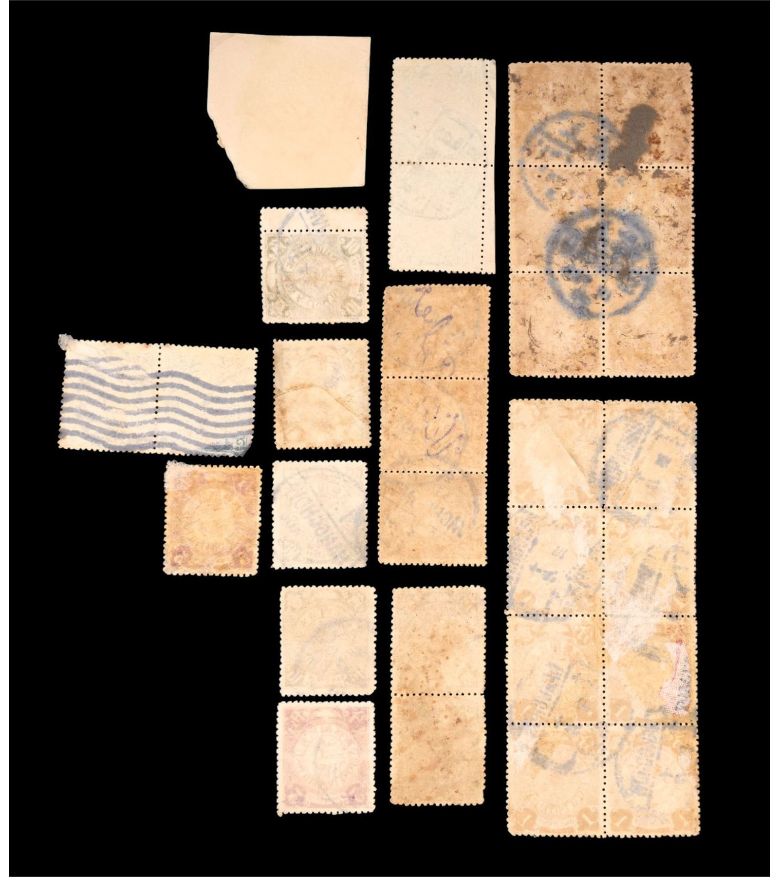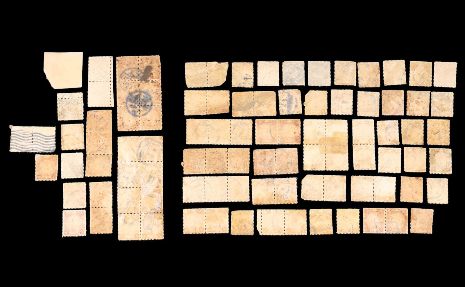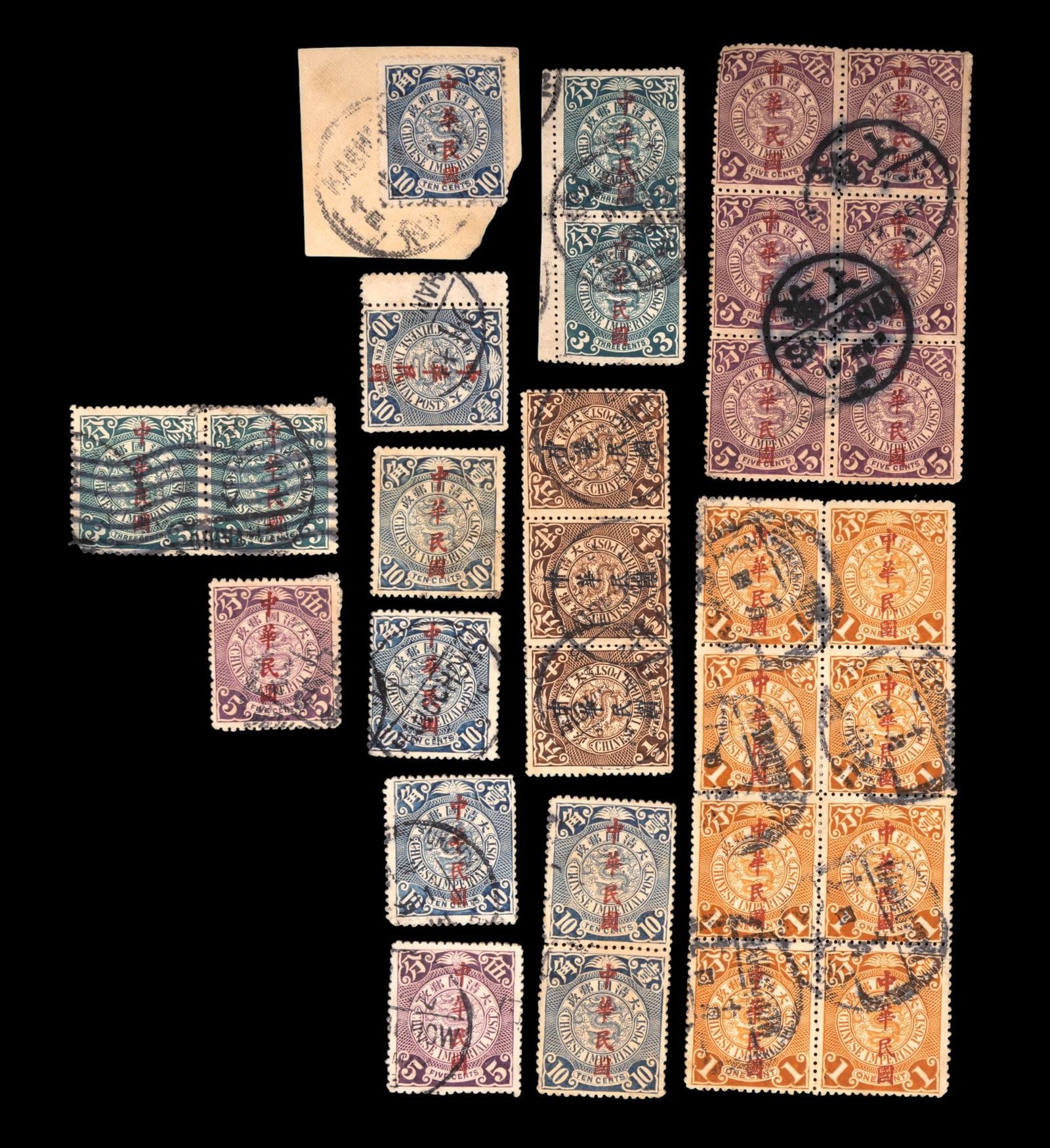 Grouping of 1912 Chinese ROC overprint stamps with red ink in normal characters and with many different denominations present. Grouping includes many different stamps, in condition varying from very good to slightly worn as seen in photography. Some stamps have retained gum.