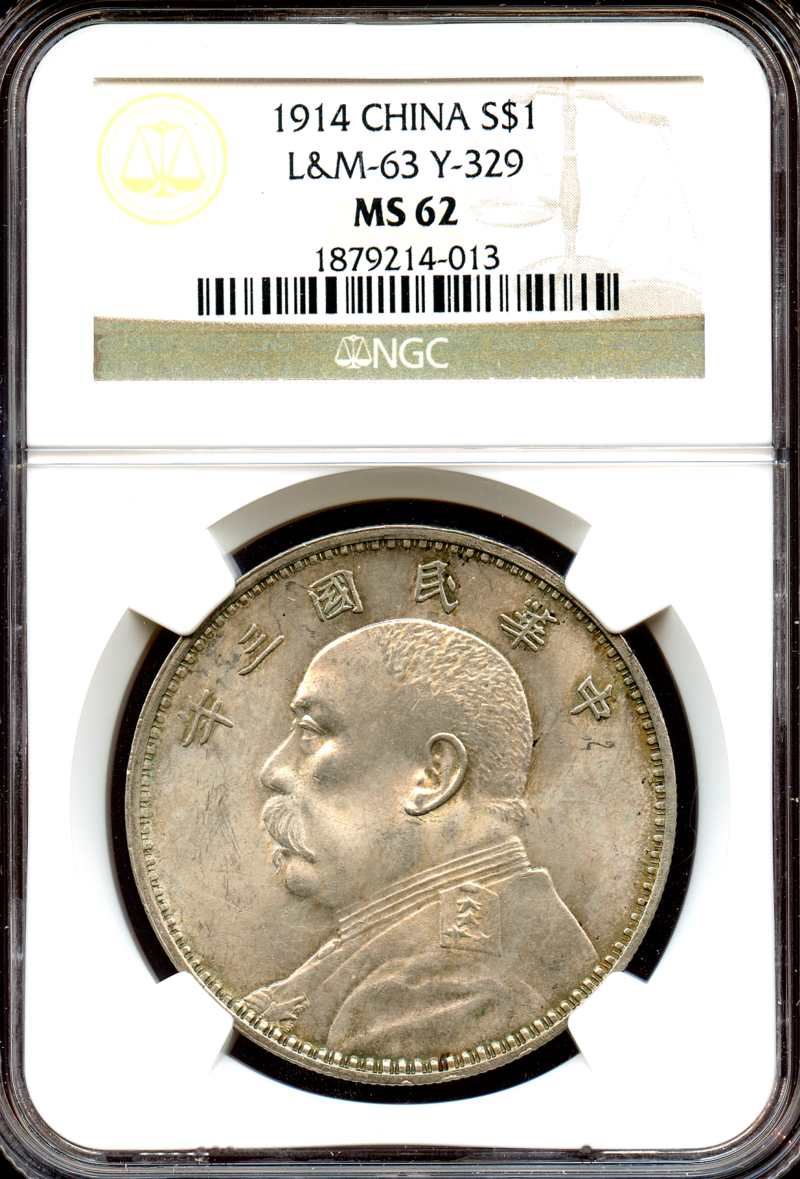 China 1914, Silver Dollar, Republic, Yuan Shih Kai, Year 3, L&M 63, Fatman type, Choice luster and few marks, NGC certified MS-62