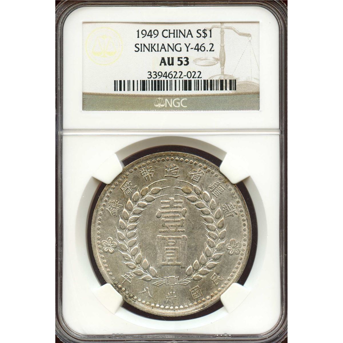 China 1949, Sinkiang, Silver Dollar, Variety with thick 1 and base of 1 pointed, Y 46.2, NGC certified AU-53