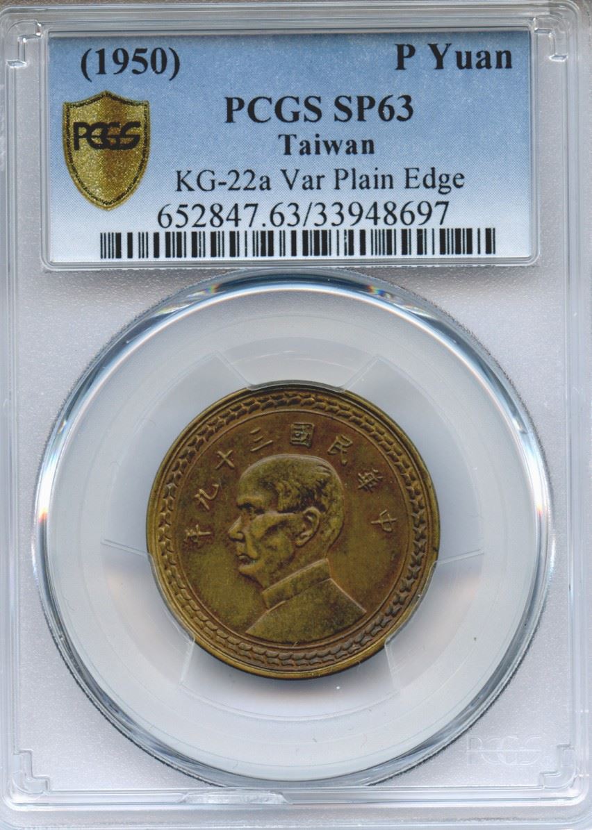 China 1950 (Taiwan), Pattern 1 Yuan, Struck in aluminum bronze, KG 22a, Variety with a plain edge, A scarce pattern coin! PCGS certified Specimen 63 (color is even reddish brown, not toned or uneven)
