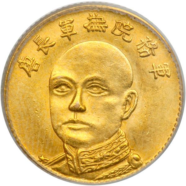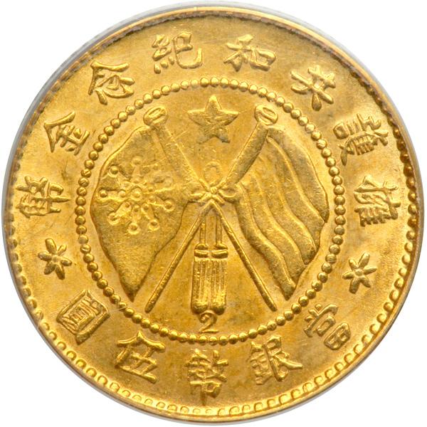 China. 5 Dollars (1919). Fr-12; KM-Y-481. Numeral 2 below flag. Facing head of General Tang Chi Yao. Reverse: Crossed flags. PCGS graded MS-62.