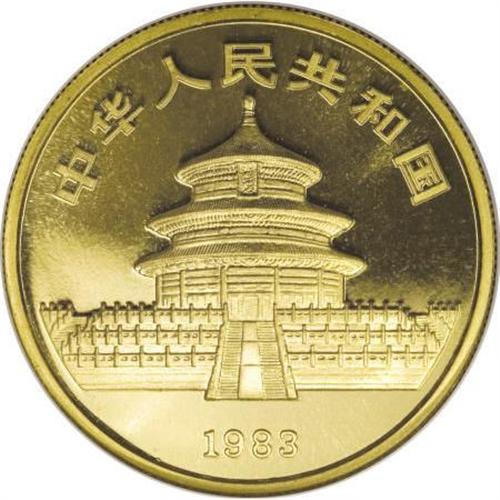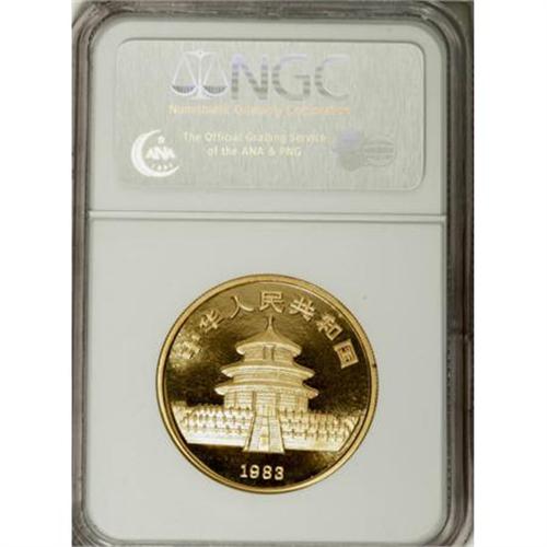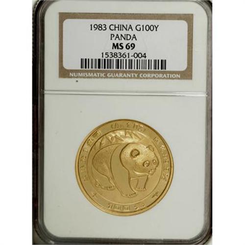 <B>People's Republic gold 100 Yuan Panda 1983,</B></I> KM-Y52, MS69 NGC, Panda walking with bamboo in background.<BR><BR><b>Shipping:</b> Coins & Currency (<a target="_blank" href="http://www.heritageauctions.com/common/shipping.php">view shipping information</a>)