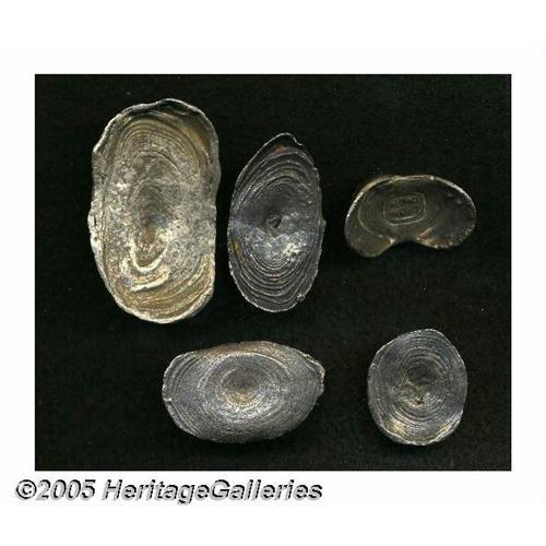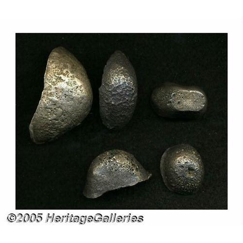 <B>Collection of Silver Sycee, </B></I>five examples of this fascinating silver bullion monetary form including four "drum kettle" types in varying weights described by the consignor as 1, 1 1/2, 2 and 3 Tael, and one "shoe" money with Chinese characters stamped on the top, 36.63 grams. All appear to be genuine and in attractive condition. <B>Sold as is, no return lot.</B></I>