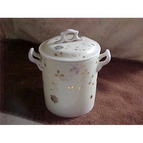 Condensed milk container, china, unmarked, cream color base with gold embossed flowers on cover and base; 2 handles, ready to use. condition: good; 5.25 " tall X 5" Diameter.