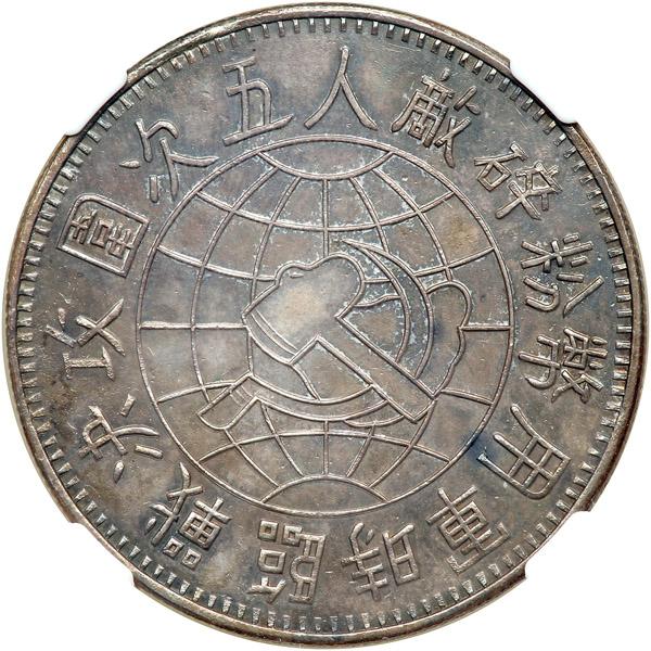 China. Fantasy Soviet Dollar, 1934. Kann-F808; KM-X-M1047. Hammer and sickle on globe. Toned. NGC graded MS-62.