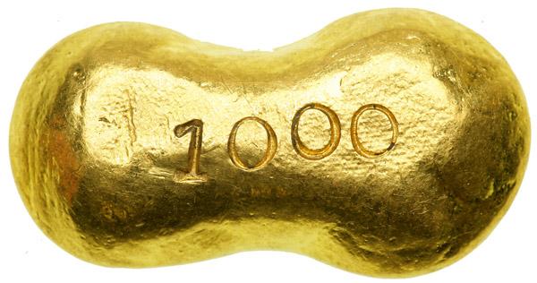 China. Gold 1 Tael Ingot, ND. 31 grams. 14 mm x 27 mm. Late Qing / Early Republic (1644-1911). Two stamps. Reverse: '1000' stamped. Very Fine.