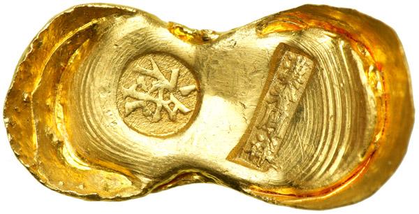 China. Gold 2 Taels Sycee, ND. 62.3 grams. 34 mm. Qing Dynasty / Early Republic (1644-1911). Extremely Fine.