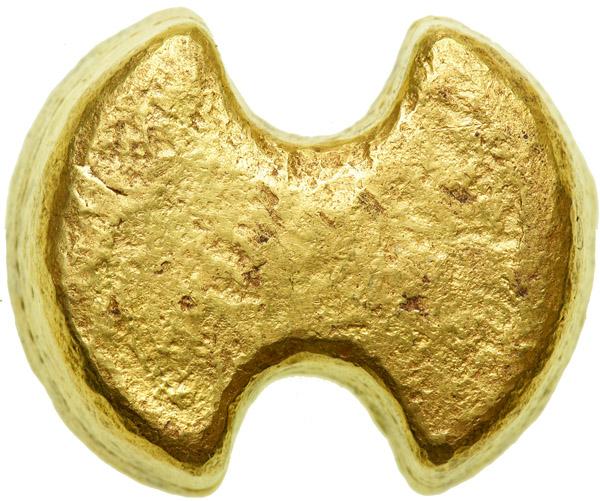 China. Gold 5 Taels Sycee, ND. 186 grams. Jin Dynasty, 1116-1234. With two stamps. Extremely Fine.