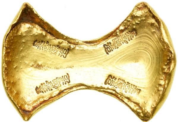 China. Gold 5 Taels Sycee, ND. 185 grams. Yuan Dynasty, 1271-1368. With four stamps. Extremely Fine.