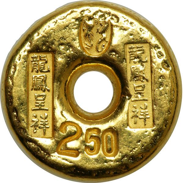 China. Gold Annulet, ND. Weight 38.0 grams. Fineness not stamped. 25.3 mm. In the shape of Cash money. Four stamps. At top two facing figures (a bird and dragon); stamps left and right same inscription (good luck, ect); at bottom 250. Reverse: Blank. Extremely Fine.