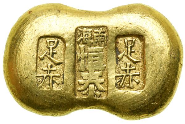 China. Gold Bar (Peanut shape), ND. 31 grams. 22.4 mm x 14.2 mm. Late Ching. Heng Tai. South Sea County. Three stamps. Reverse: Blank. Very Fine.