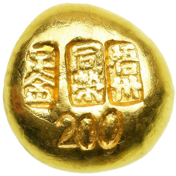 China. Gold Ingot, ND. 7.5 grams. 12.3 mm. Three stamps with 200 stamped below. Reverse: Blank. Very Fine.