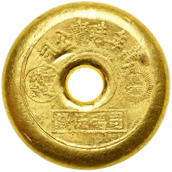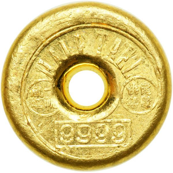 China. Gold Round ½ Tael, ND. 18.65 grams. 20 mm. Stamped HALF TAEL 9999. Reverse: Stampes. Extremely Fine.