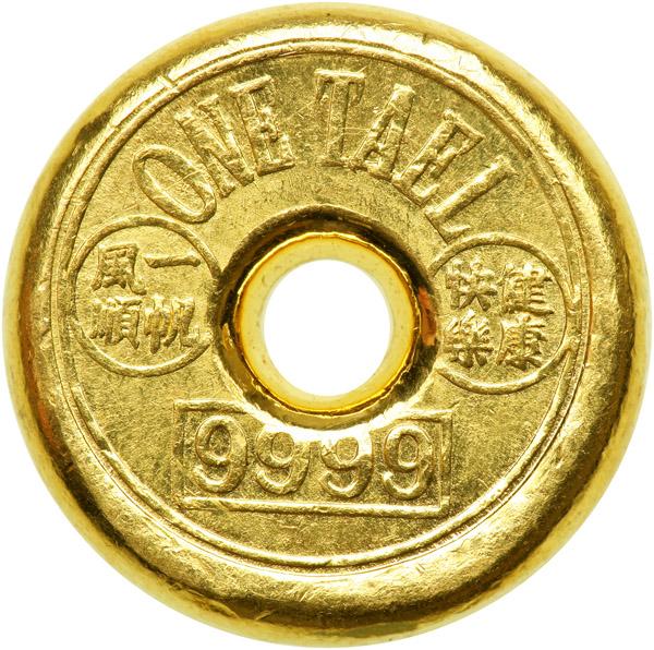 China. Gold Round 1 Tael, ND. 37.5 grams. 24.5 mm. Stamped ONE TAEL 9999. Reverse: Stamps. Extremely Fine.