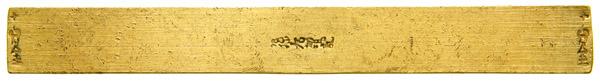 China. Gold Tablet Bar, ND. 36.8 grams. 14 mm wide 123 mm length. Souther Song Dynasty (1127-1279). Stamps at both ends and in the center. Reverse: Blank. Very Fine.