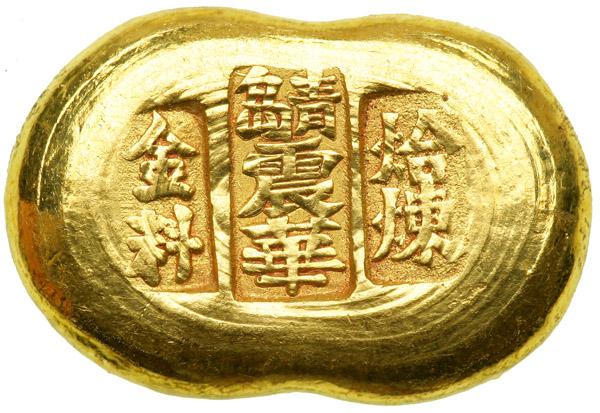 China. Gold Tael Ingot, ND. 31 grams. Late Qing / Early Republic (1644-1911). 24 mm x 16 mm. Three stamps. Very Fine.
