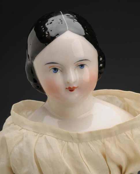 Description Germany, Ca. 1850. China shoulder head with pink tint complexion (some pocking on hair and shoulder), blue painted eyes, black hair with white center part and all round sausage curls, closed mouth with white space between lips. Vintage cloth body with china lower arms. Vintage white cotton underwear, original stockings and boots (seam split on one). Condition (Excellent). Size 15" T.