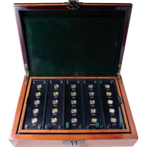 <B>People’s Republic 25th Anniversary set of Proof 15 Yuan gold Pandas 2007,</B></I> <B> </B></I> 25 pieces total, each 1/25 oz. gold, each piece bears the obverse style of a different date gold Panda from 1982 through 2007, all of the reverse are the Temple of Heaven, all dated 2007, all Gem Proof in a beautiful custom wooden case with certificate.<BR><BR><b>Shipping:</b> Coins & Currency (<a target="_blank" href="http://www.heritageauctions.com/common/shipping.php">view shipping information</a>)