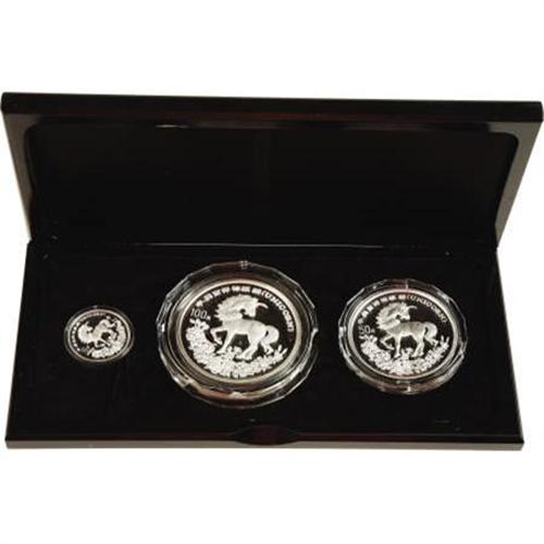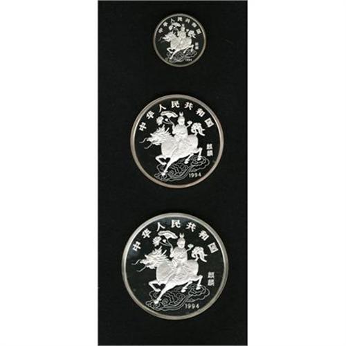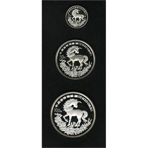 <B>People's Republic Silver Unicorn Three Piece Set 1994,</B></I><BR> 10 Yuan, KM420, 50 Yuan, KM424 and 100 Yuan, KM426, all Gem Proof in the original case with certificate. The plastic capsules holding the coins are broken.<BR><BR><b>Shipping:</b> Coins & Currency (<a target="_blank" href="http://www.heritageauctions.com/common/shipping.php">view shipping information</a>)
