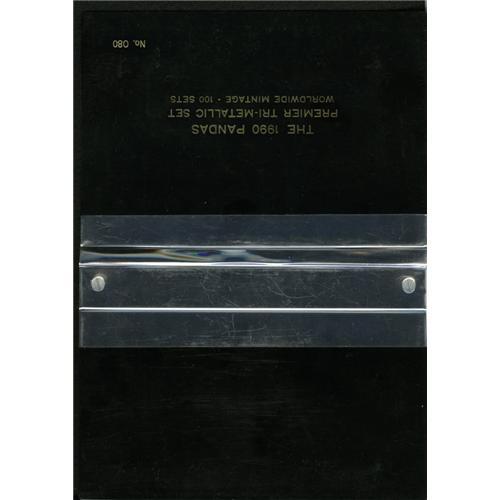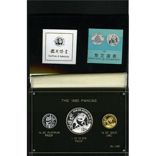<B>People's Republic, Three Coin Pandas Tri-Metallic Set, 1990,</B></I> including 1990 10 Yuan silver, KM239, Gem Proof, 25 Yuan gold, KM240, Gem Proof and 25 Yuan platinum, KM268, Gem Proof. The coins are housed in a third party plastic case with associated certificates.<BR><I>From the Marrero Family Collection.</B></I><BR><BR><b>Shipping:</b> Coins & Currency (<a target="_blank" href="http://www.heritageauctions.com/common/shipping.php">view shipping information</a>)