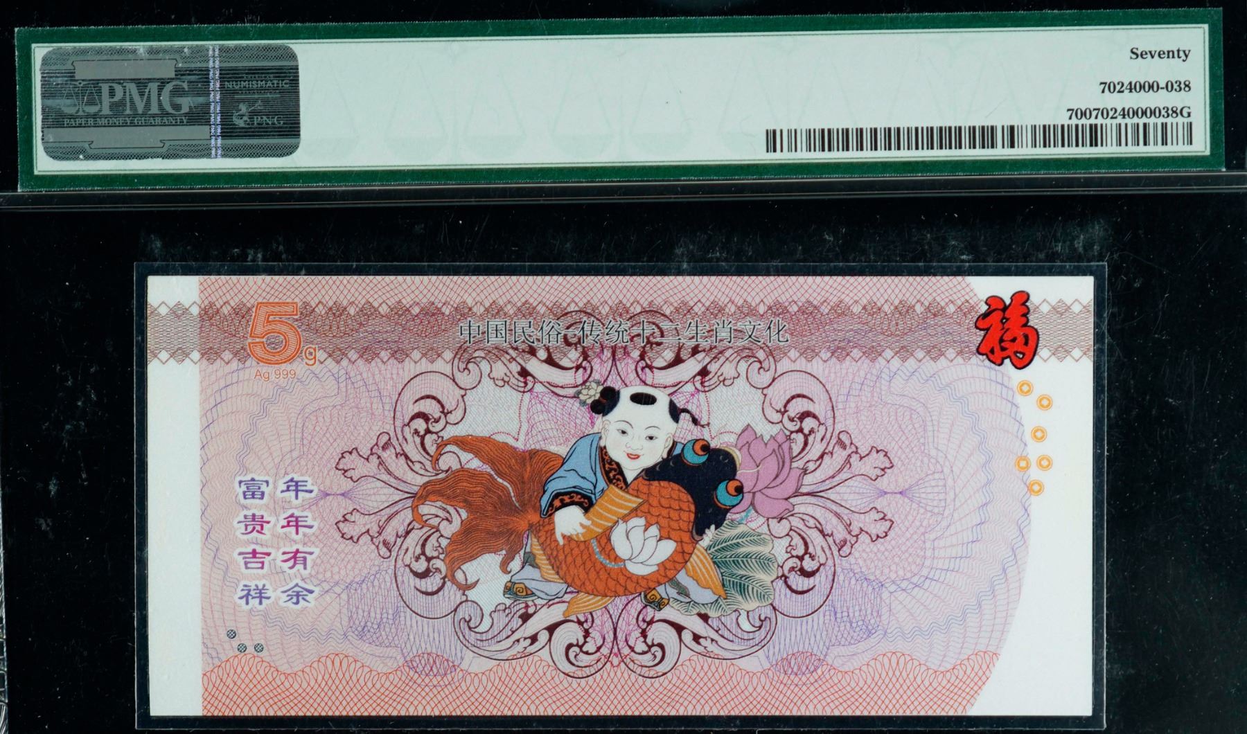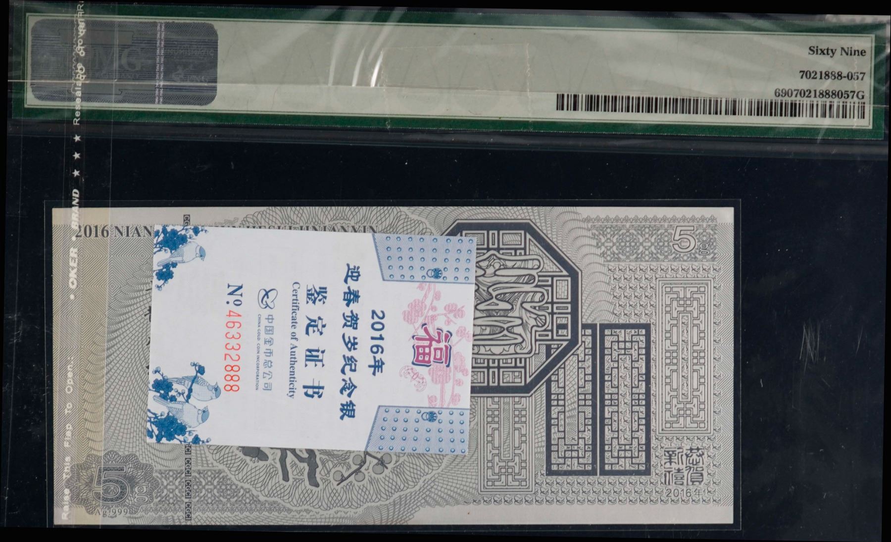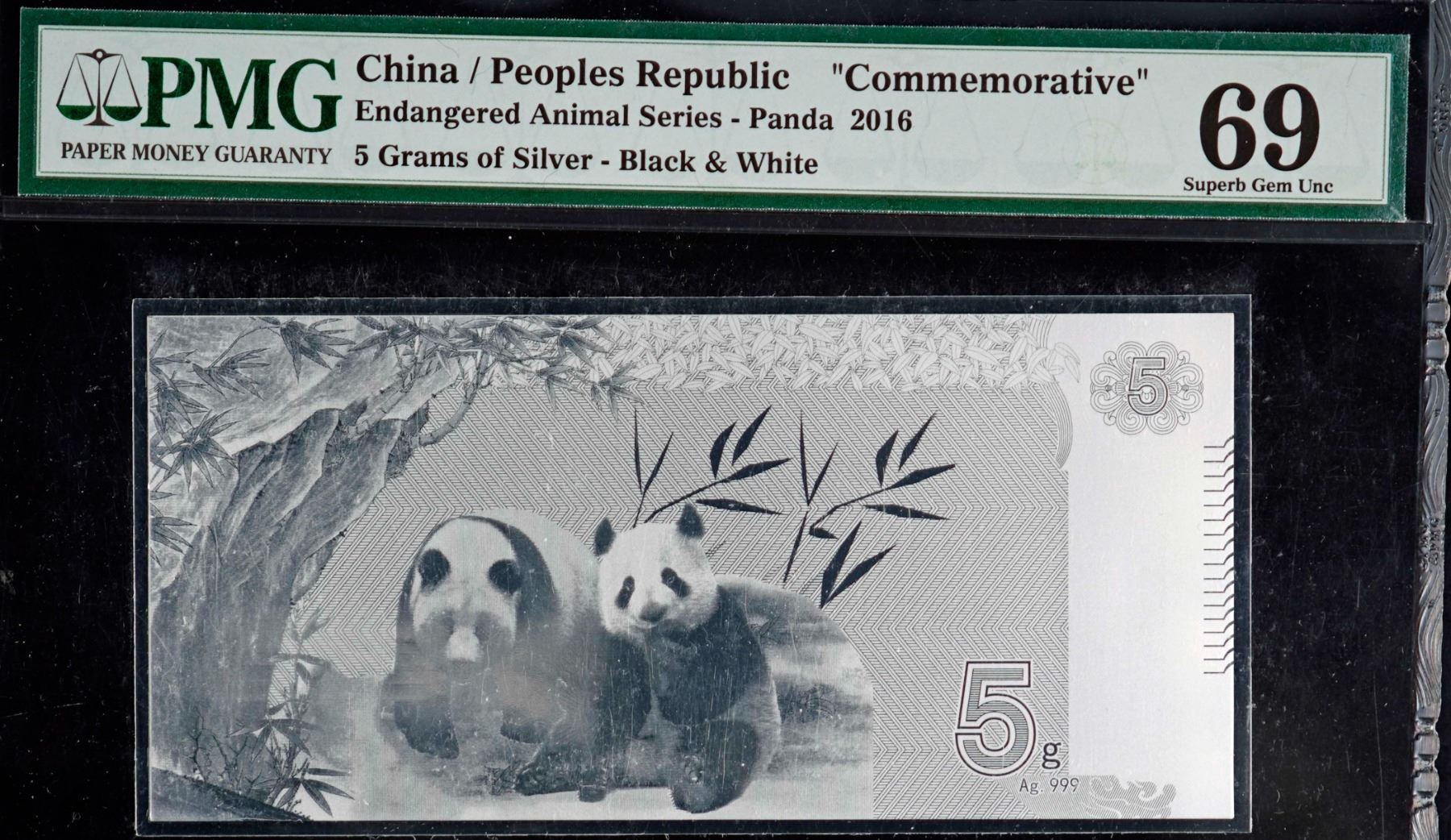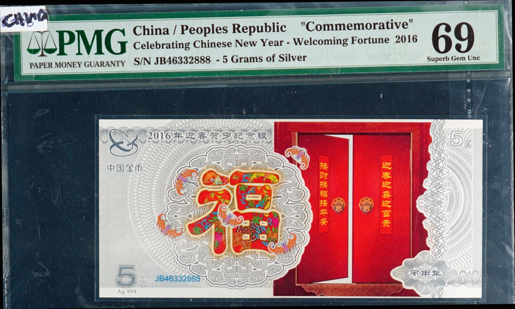 China; Peoples Republic Commemorative Notes 2016 Welcoming Fortune, 2017 Yr of the Rooster & 2016 Panda all PMG Graded Superb Gem UNC69-70. Lot of 3 notes.