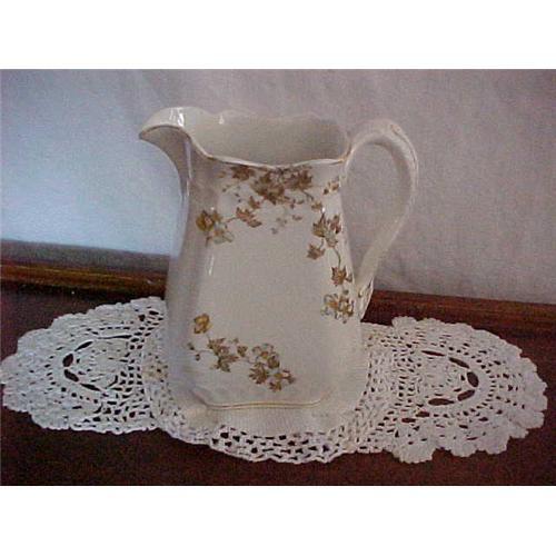 China Pitcher, John Maddock & Sons, England, Hallmark, Royal Vitreous in crown and circle, 8" tall, flower and leaves in circle; white background; excellent condition with some age checking