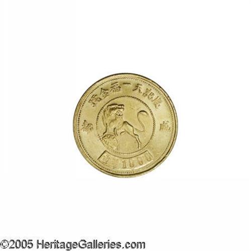 <B>Private gold Bullion Issue, </B></I>Chengtu Tianyeefoo Goldsmith, 31.23 grams, 9998 Fine, XF-AU, minor rim bump and surface marks. Obverse: Pagoda style tower; Reverse: Lion with shield. Unlisted in C. Bruce and the first we have seen.