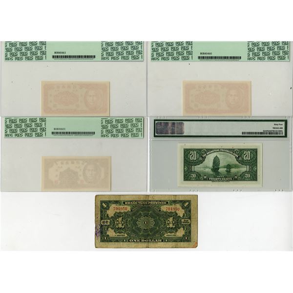 China, 1918-49. Lot of 5 Issued Banknotes, Includes: Hainan Bank 2 Cents, P-S1452 S/M#H3-2, 1949, HKPA, PCGS graded Gem New 66PPQ; 5 Cents, P-S1453 (2) S/M#H3-3, Both are PCGS graded Gem New 65PPQ, HKPA; Provincial Bank of Kwangtung Province 1 Dollar, P-S2401e S/M#K55-20b, 1918, ABNC; Kwangtung Provincial Bank 20 Cents, P-S2437b S/M#K56-32a, PMG graded Choice Unc 64, ABNC. (5). Sold "AS IS" no returns accepted.