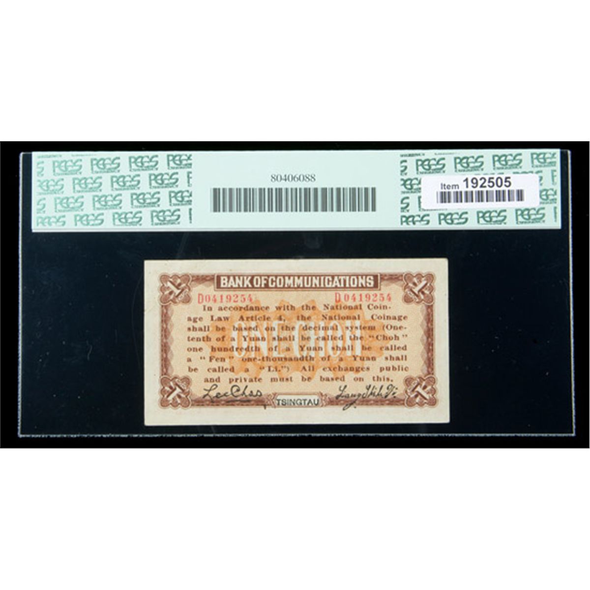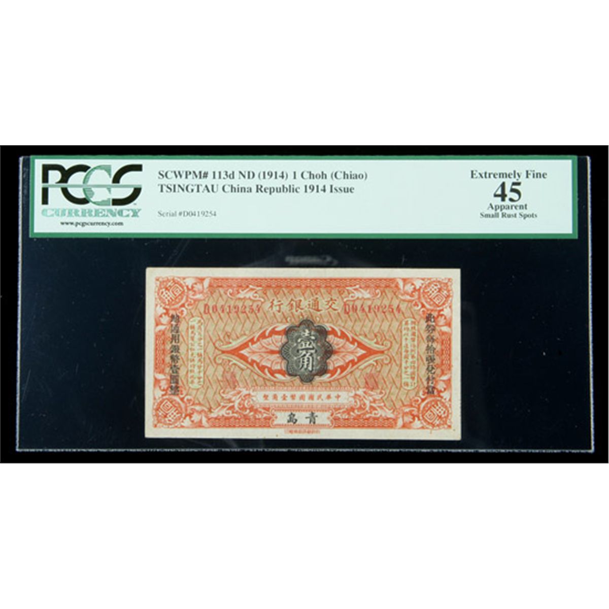 China Republic SCWPM# 113d, ND (1914) 1 Choh (Chiao) TSINGTAU. PCGS Extremely Fine 45 Apparent. . Fr-P-113d. A very scarce note in any grade, this piece was assigned an "Apparent" grade by PCGS Currency due to some small rust spots on both sides of the note.