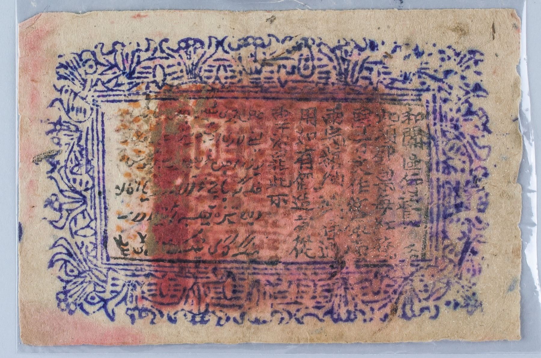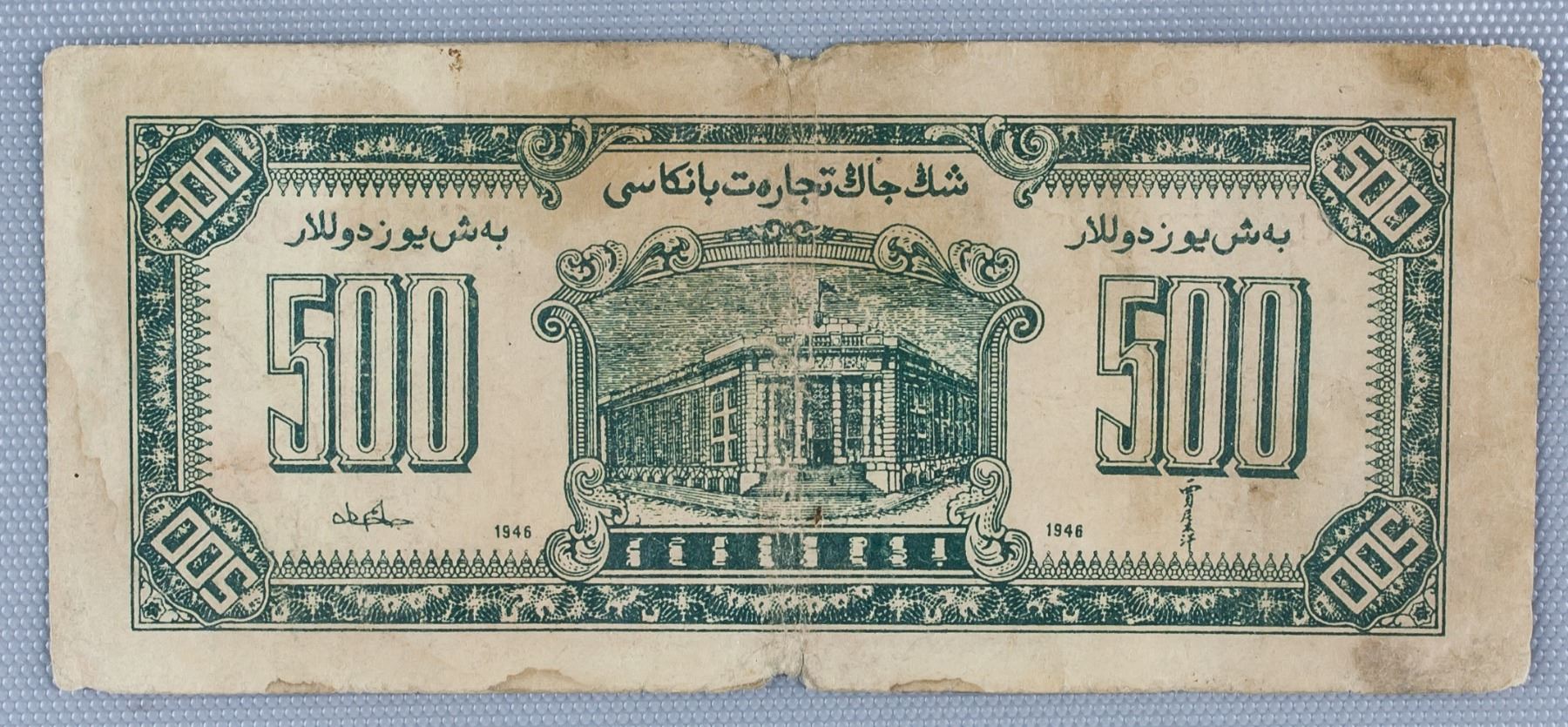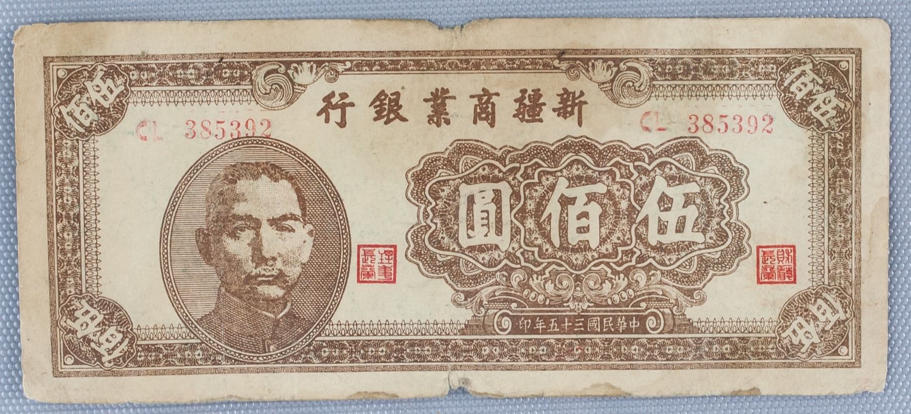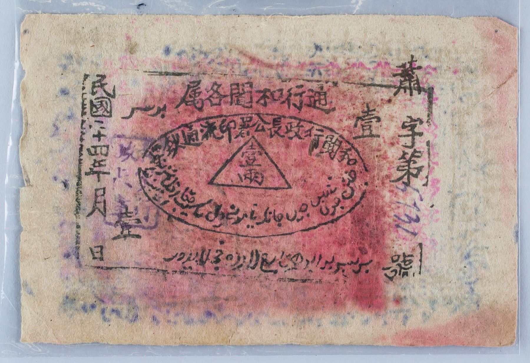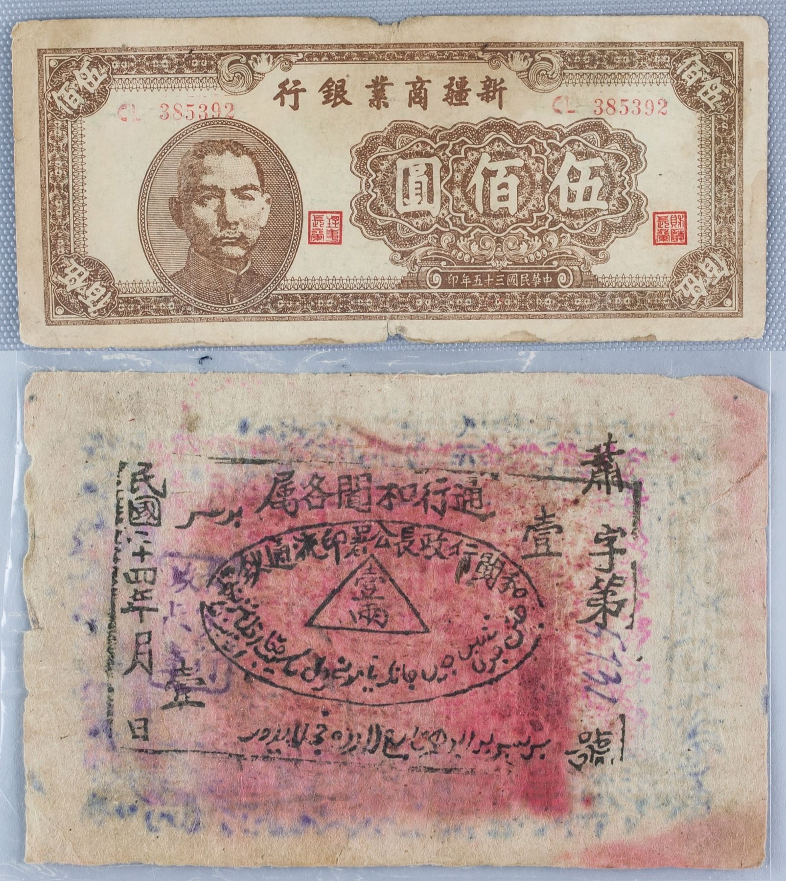 Two (2) assorted Chinese Republic banknotes, one 1946 500 Dollar banknote, Xinjiang Commerical Bank, serial number CL 385392, one 1935 1 Tael banknote, Hetian Administration, serial number Xiao 5731, 7 x 16 cm, 10 x 15 cm