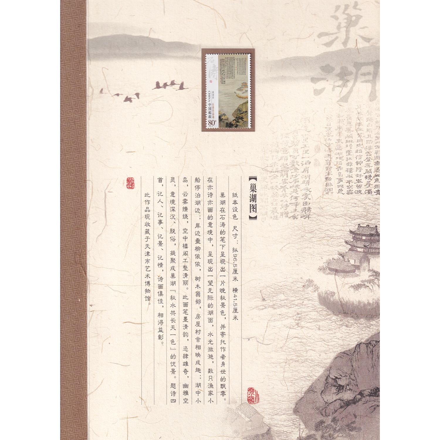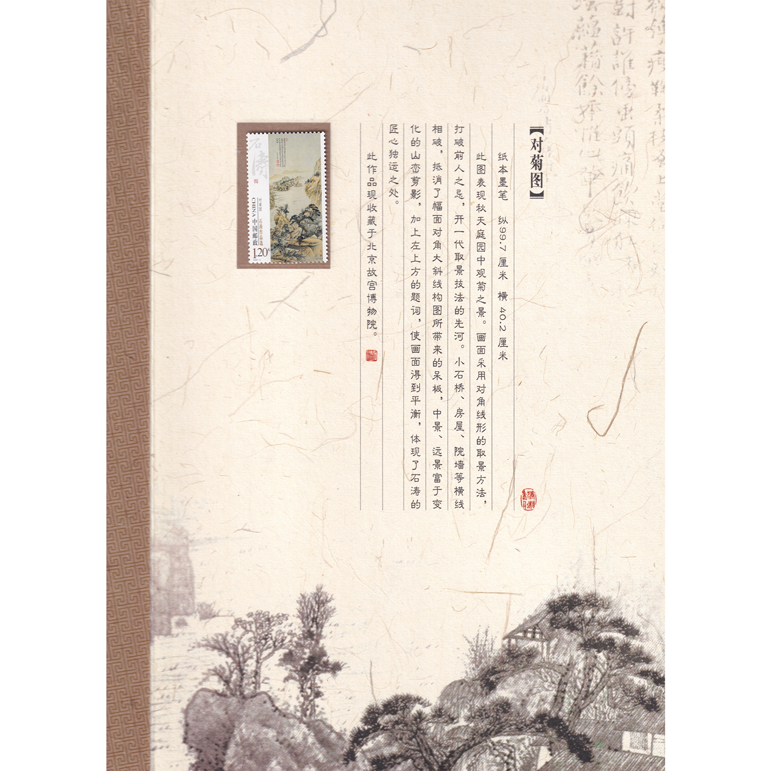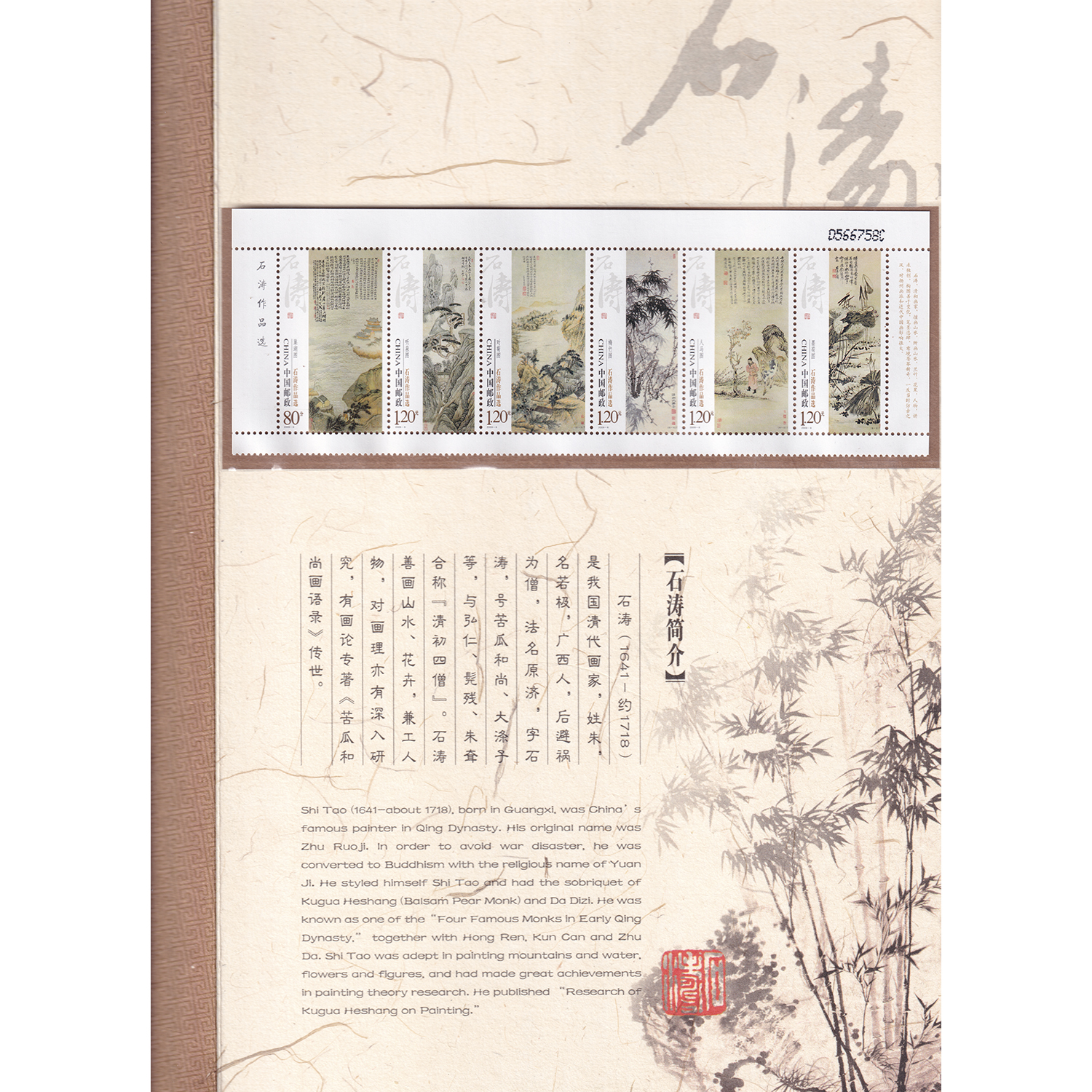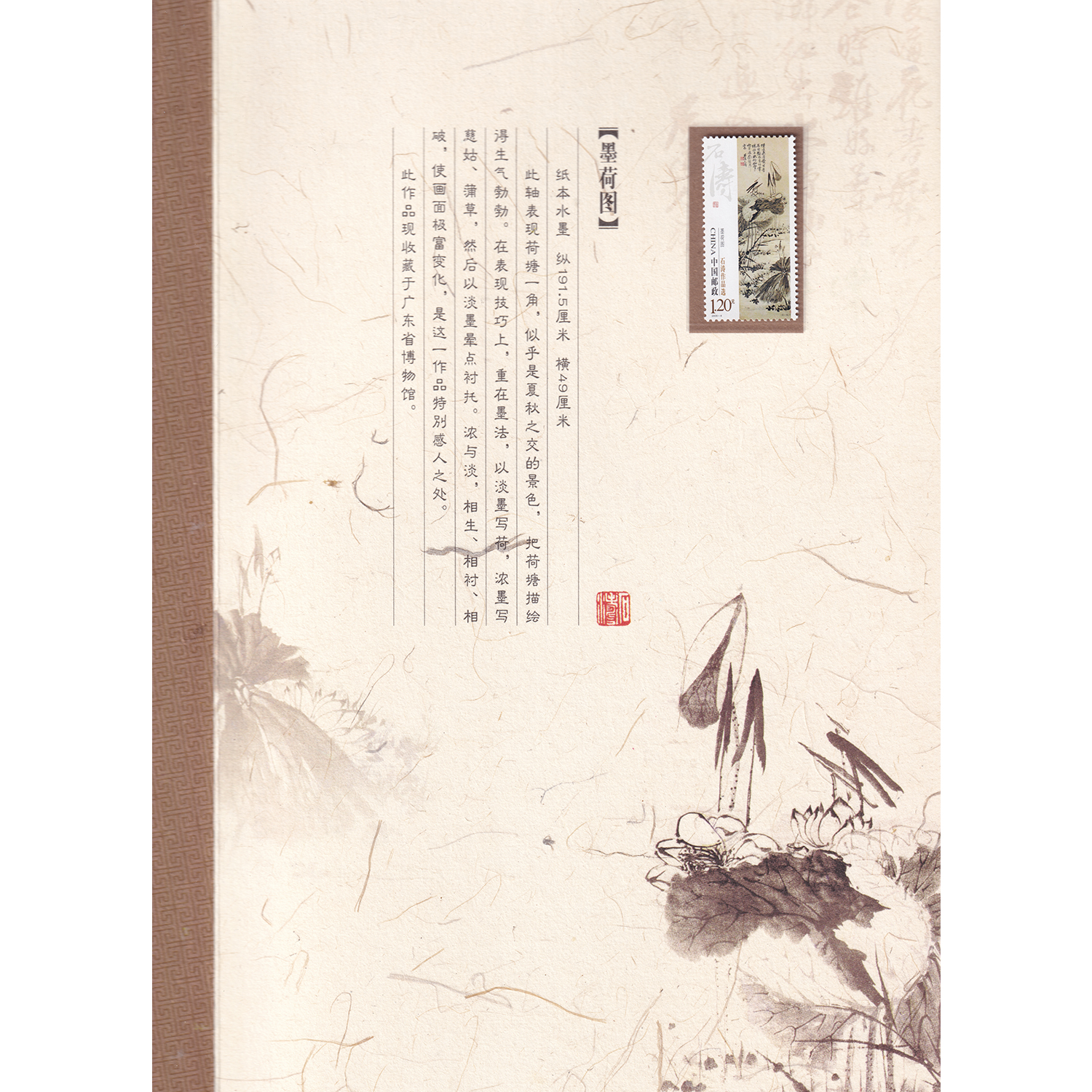 This book features various stamps, as well as beautiful traditional Chinese art by artist Shi Tao on each page.