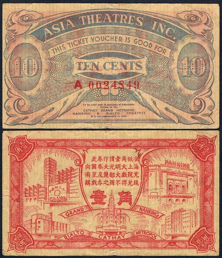 China, Shanghai, Asia Theatres Incorporated, Chiao (10 Cents), c.1940, gFine
