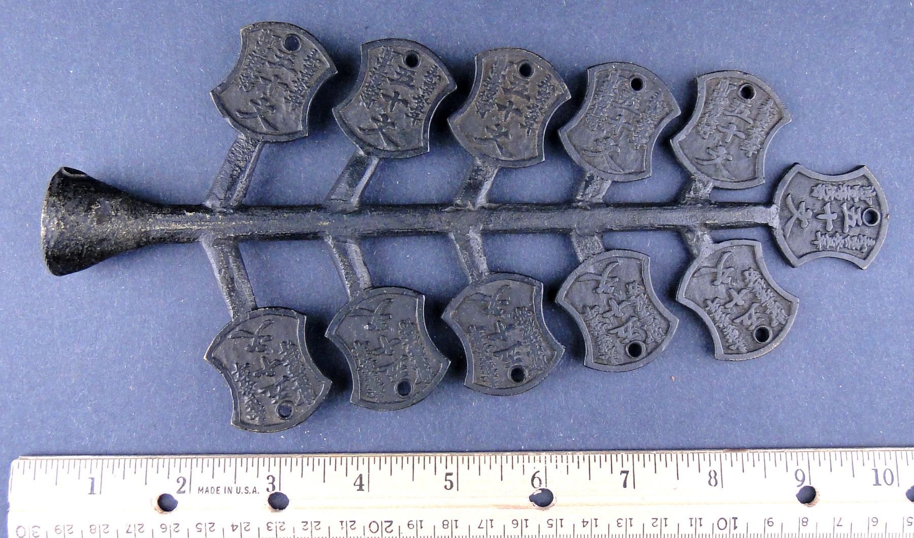 Description: China, souvenir bronze money tree with 11 fundo-shaped pieces with cast-in holes. Rare. Illustrated in Opitz, p. 229, top left.