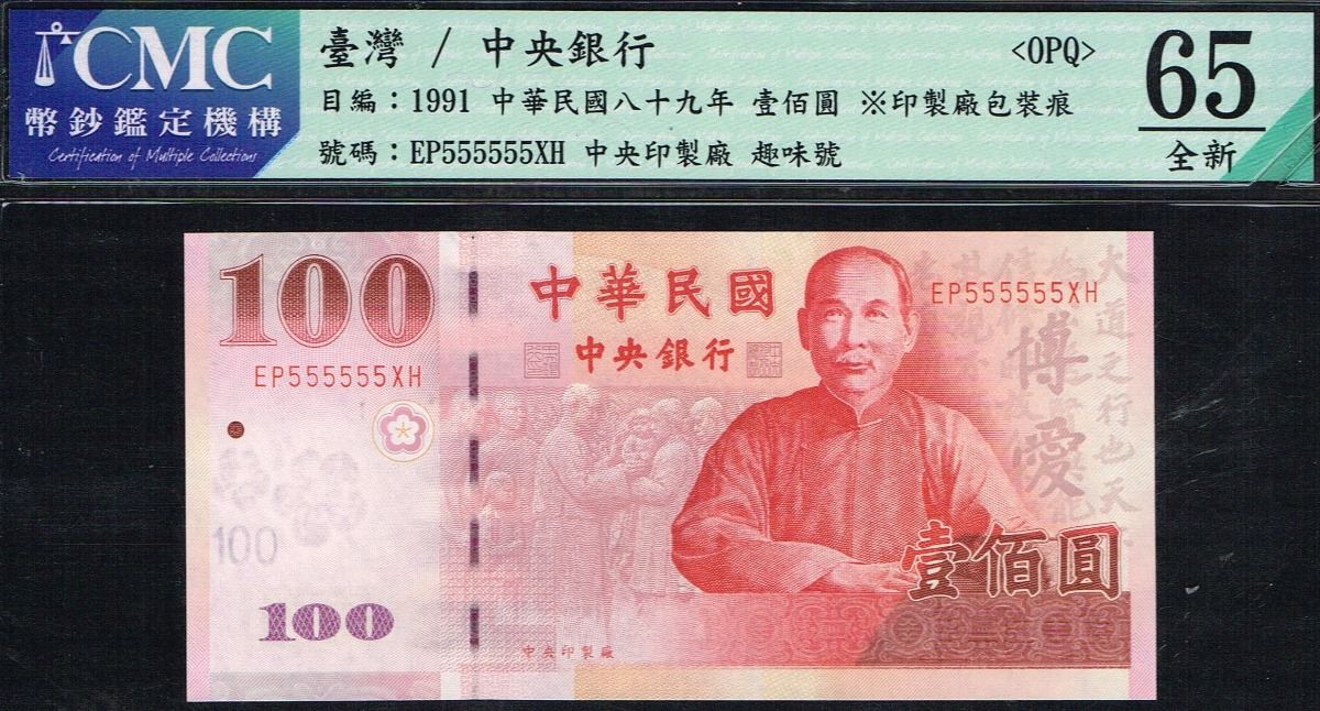 China Taiwan, 100 Yuan, 2000, Pick# 1991, SOLID FANCY #, Taiwan / The Central Bank, SL# EP 555555XH, (CMC) OPQ 65 UNC