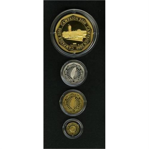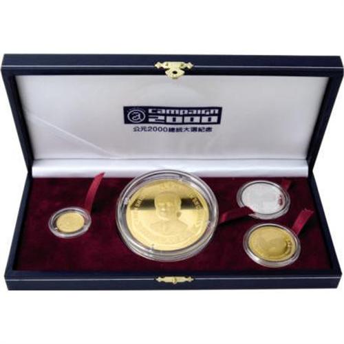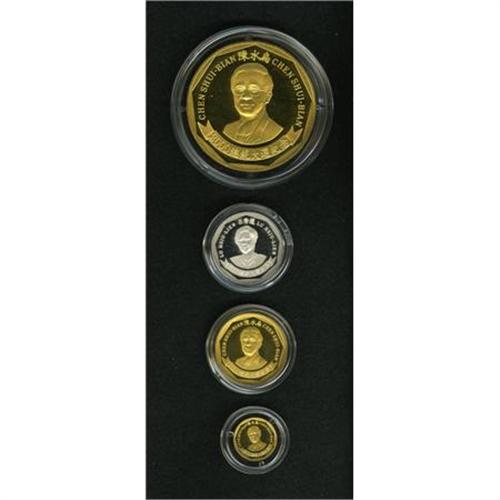 <B>Taiwan four-piece gold and silver Inauguration Proof set 2000,</B></I> 7.97 g, 33.09 g, and 155.1 g gold, all with facing bust of President Chen Shui-Bian on the obverse and various reverse motifs with legend, CAMPAIGN 2000, also an 18.07 g silver piece with obverse portrait of Vice-President Lu Hsiu-Lien (Annette LU), The set is Gem cameo Proof in the original case. This is the first set of this type that we have seen and we feel certain that very few were struck.<BR><BR><b>Shipping:</b> Coins & Currency (<a target="_blank" href="http://www.heritageauctions.com/common/shipping.php">view shipping information</a>)
