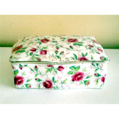 </font></strong>A lovely rectangular shaped china trinket box signed ESD Japan. Hand painted with deep pink full blown roses and rosebuds and green leaves on a white background. Lid has a gold rim around the outer edge. Measures 5" inches wide from east to west and stands 1-3/4" inches tall and is 3-1/4" inches deep. Excellent condition, no chips, cracks or crazing. </font>