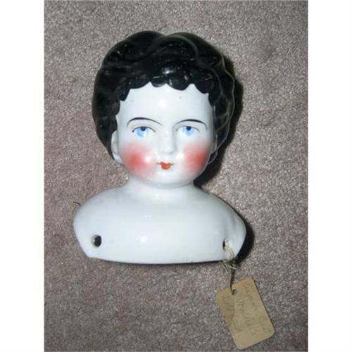 This is a more unusual china head that would have been made in Germany. You can not read the number in the back as the mold was poured lots of times but there is an indent where the number is. There is very little wear to the black paint. There is just a little rough spot on the inside corner by one of the sew holes. She has exposed ears and the light organish lines above her eyes. The hair style is unusual in that it has curls around the face and in the center there are like 2 large curls right in the center of her head, then the hair curls to the back with a ridge being formed. She has very bright cheeks. There is old cotton stuffed inside the head and the old tag says Eugenia Cast Walker's Doll head. She was born Oct. 7, 1873. Rag doll was named Martha. She now only has the head so maybe the body detoriated at some point in time. She has two sew holes in the front and two in the back. She is 4" tall, about 3 3/4" across on the top shoulder to shoulder, front to back from the base is 2". She measures about 8" around just above the ears. There are some pit marks from the early firing. Buyer to pay $10 for U.S. priority mailing, insurance, and handling. Thanks for viewing.