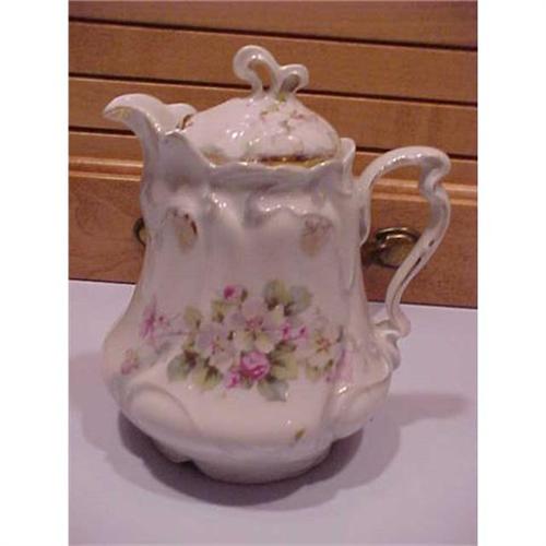 This little pitcher has a pretty lid and what I think is transfer decoration. The mark is reddish but not legible. The numbers 569 are embossed on the bottom. There is no damage or repairs. A lovely thing!