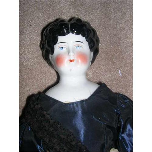 This is an early Germany china head. She is 21" tall but her head is 5" tall. She has the early white center part, the exposed ears, and the very rounded shoulders. She is marked with a 7 on the back. She has some old pit marks from the impurities during firing. I think it give her character. She has the red nostril dots, line above the eyes, and through the lips. She has very high cheek coloring. The hair is straight across in the back, one white rub spot at the bottom. The black hair is swirled around the ear so you can see the exposed ear. She is on an old body but it has seen better days. Some of it is leather and some is cloth. The hands are mitten type and very soiled. She has a great old half slip and pantaloons. The dress has been added later but looks fine. These earlier china heads are getting harder to find. She is from a smoke free environment. If you can love him, please bid. Buyer to pay $20 for shipping, insurance, and handling. Thanks for viewing.