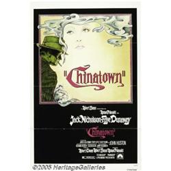 <B>Chinatown (Paramount, 1974)</B></I> One Sheet (27" X 41"). Jack Nicholson plays Jake Gittes, a private detective who's cut out of the Sam Spade and Philip Marlowe mold, who gets involved in a seedy case dealing with affairs, political corruption and incest. Faye Dunaway, as Gittes', employer portrays the ultimate femme fatale. Roman Polanski's film noir is one of the best mystery/thrillers ever produced by Hollywood, garnering 11 Academy Award nominations. There is minor fold line wear and light surface wrinkles and creases. Very Fine.