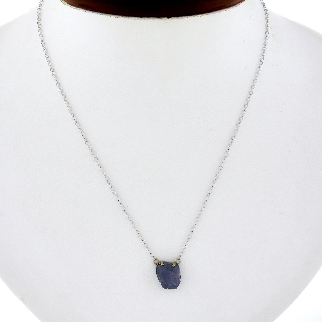 A solid 14k white gold pendant necklace by Chinchar Maloney, featuring 1 uncut natural genuine Iolite or tanzanite (purple - 9.3x8mm). 18 inch cable link chain, 1.91 grams total weight, pendant measures 9.3x8mm.