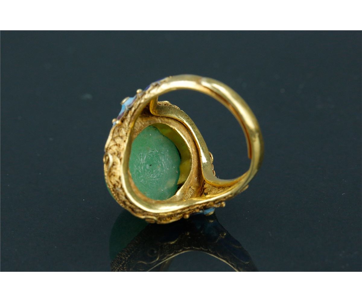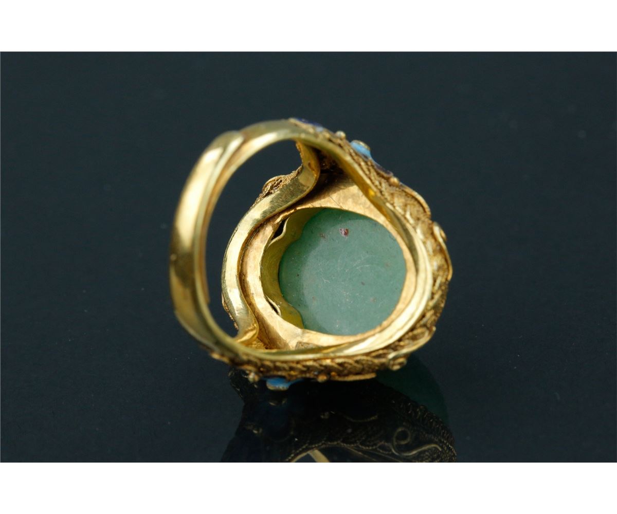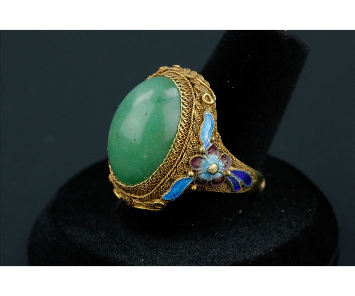 Chinese green jadeite filigree ring; featuring green jadeite cabochon decorated with filigree and cloisonne flowers; with adjustable ring size; SILVER mark; D: 2 cm, 8 grams