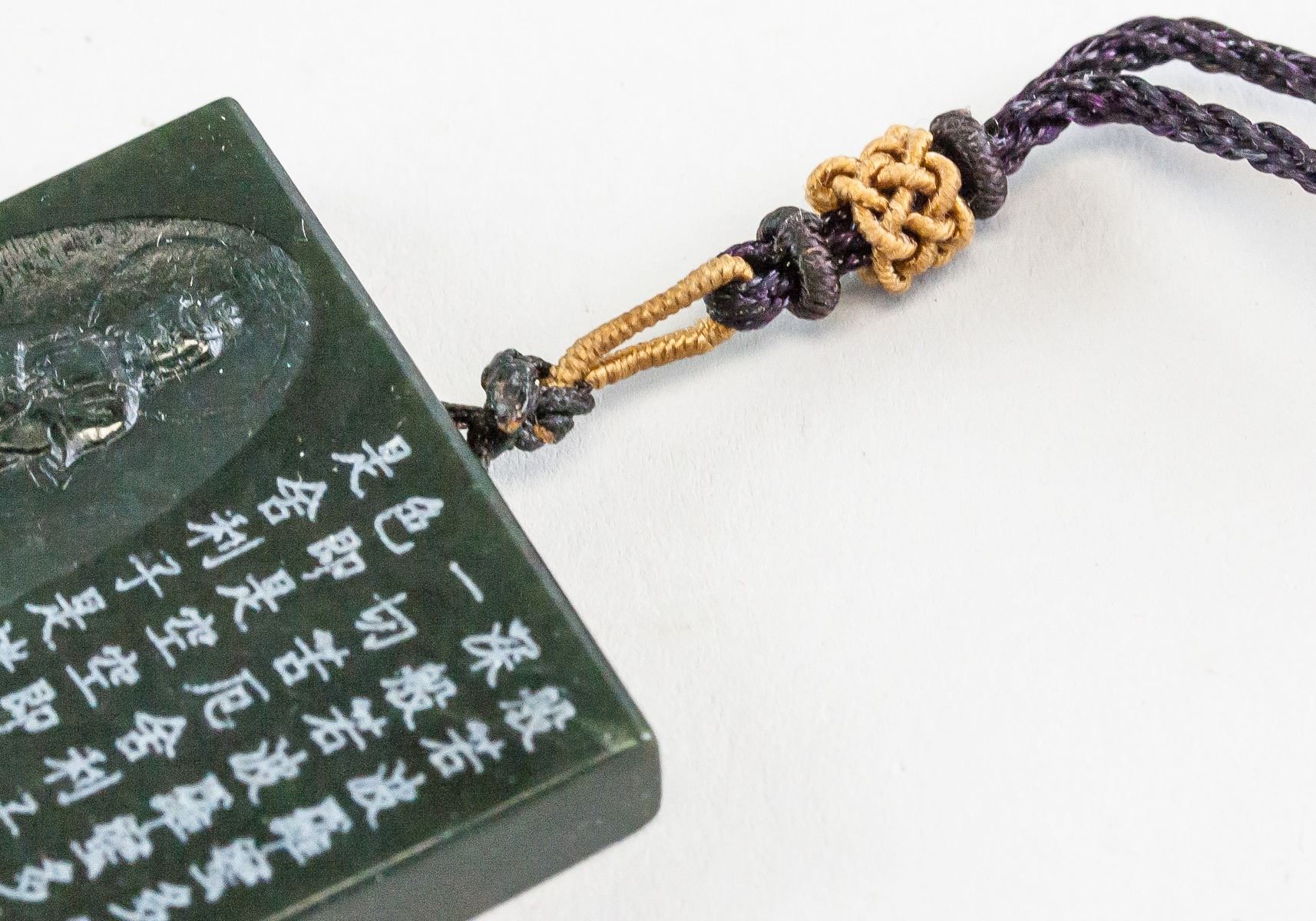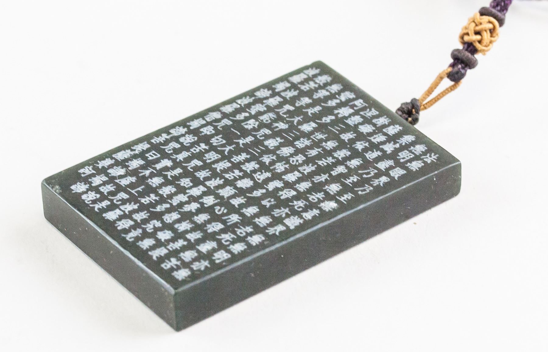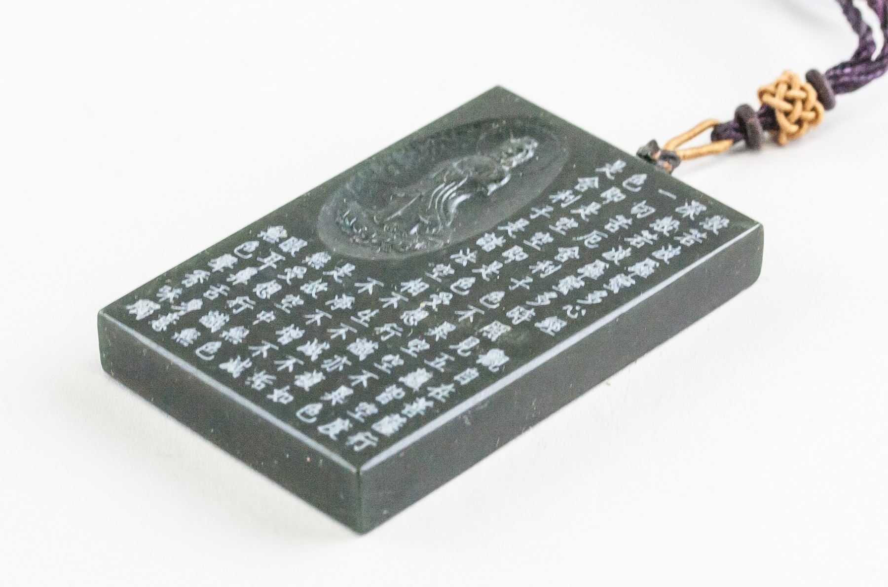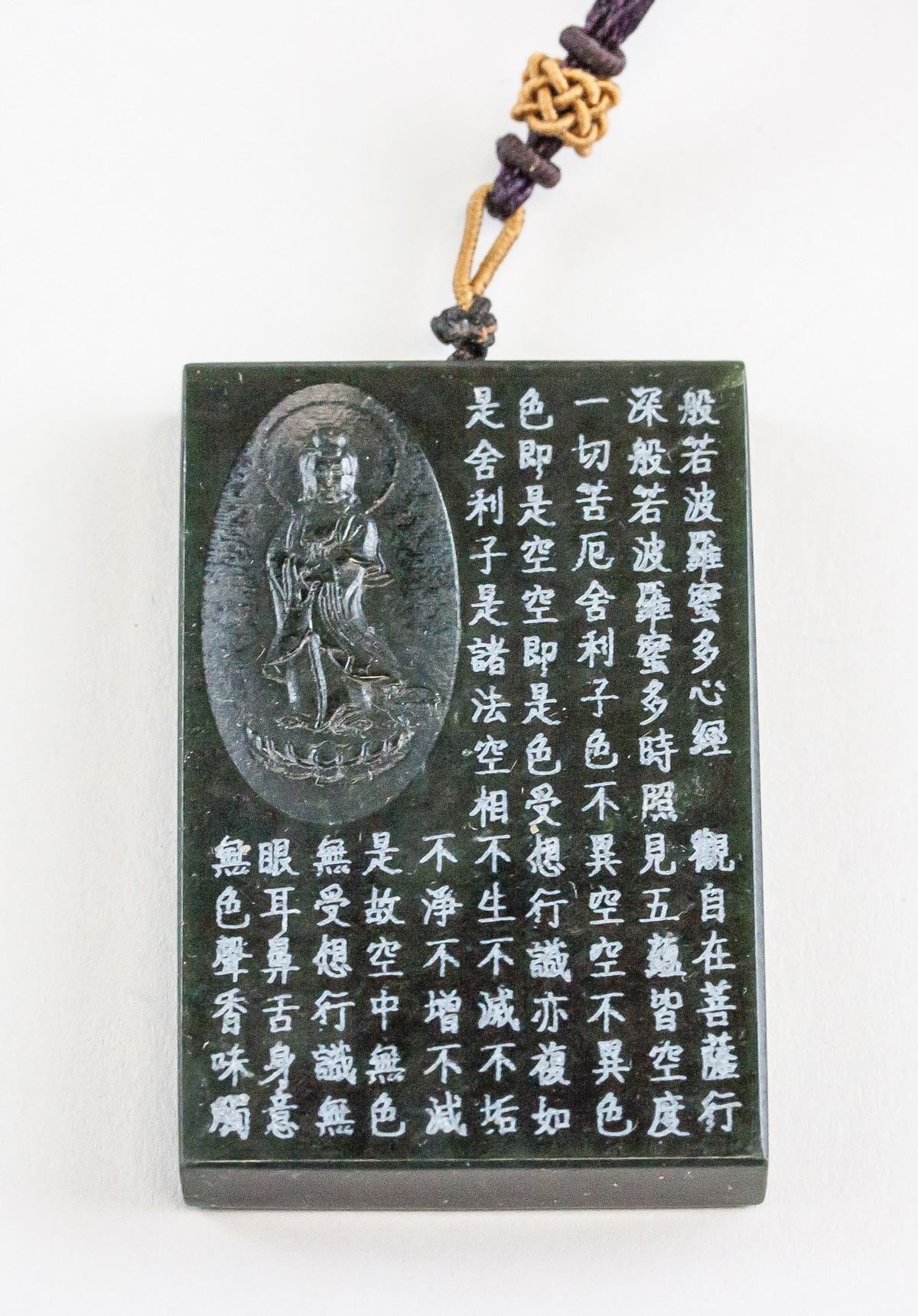 Chinese spinach jade carved toggle. Of rectangle shape. Carved Guanyin Bodhisattva and Heart Sutra. 6 x 4 cm, 61 grams. Density: 2.90