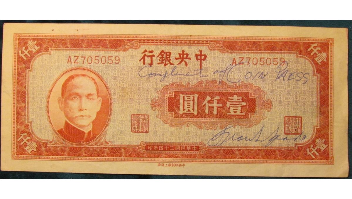 Chinese 1000 Yuan??? Note Autographed by Frank Spadone when he owned the "Coin Press Magazine", Author, Writer, and Specialist in Errors.
