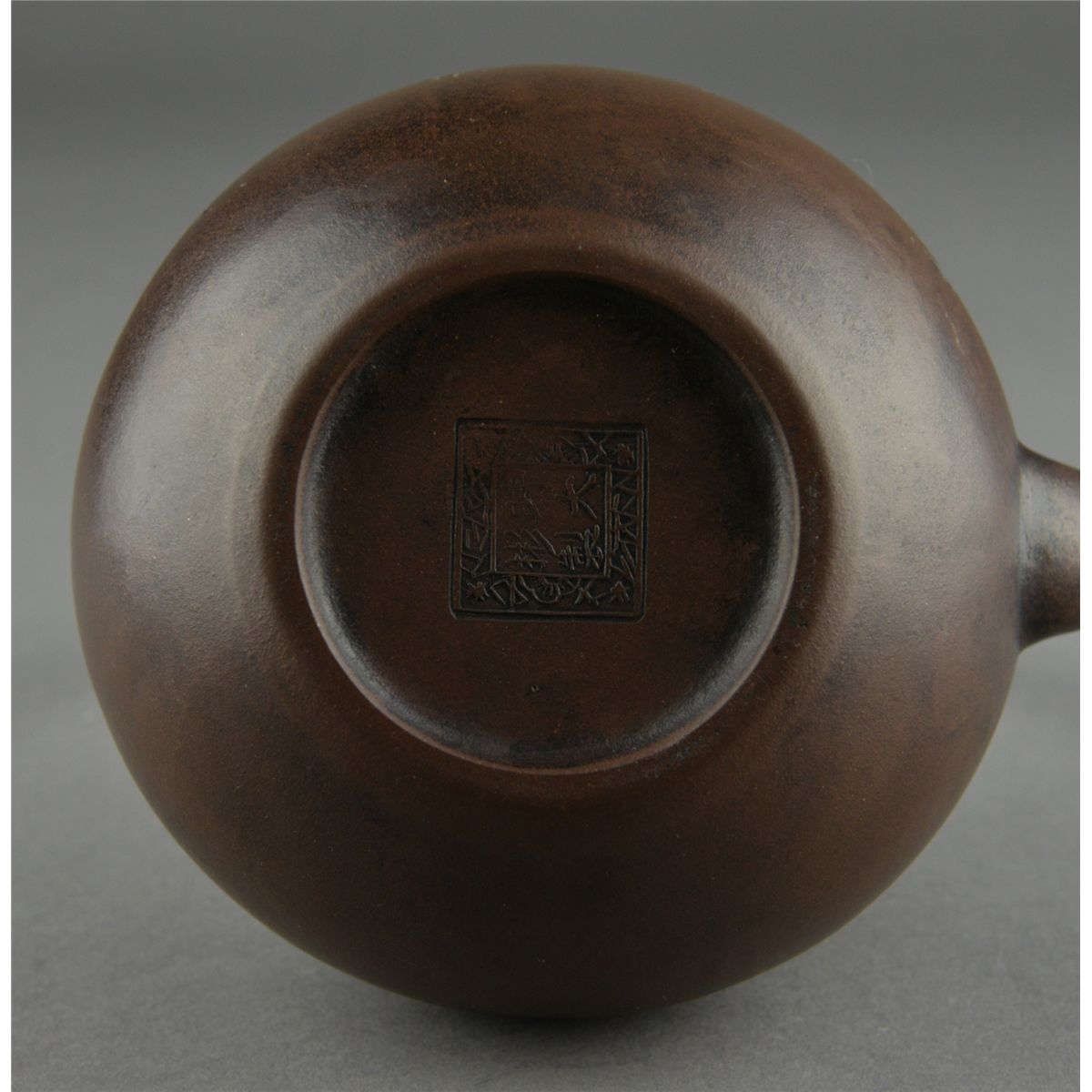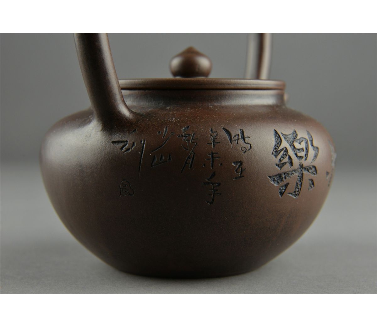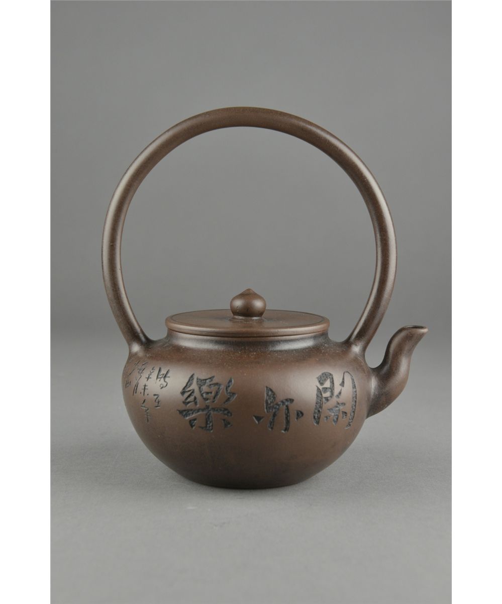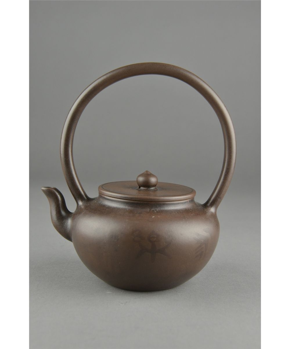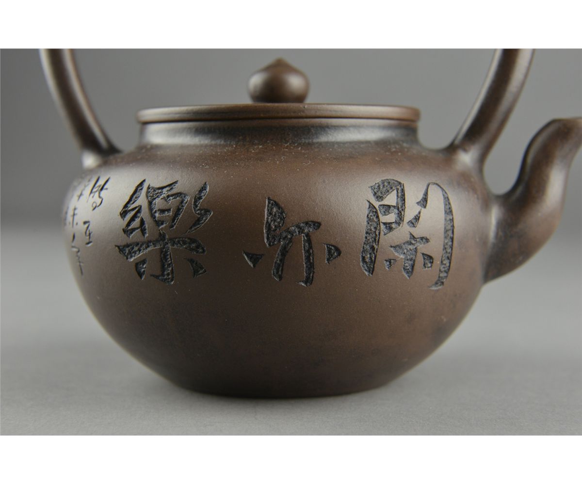 Fine Chinese Yixing pottery tea pot; signed by artist (1573-1648) who lived from Ming Wanli Period to Qing Shunzhi; four-character mark on base; comparable teapots from the same artist have sold for up to 13,440,000 RMB, 15th Century or later; H: 16.5 cm, D: 11.5 cm; Provenance: Eastern Shen Collection, Toronto