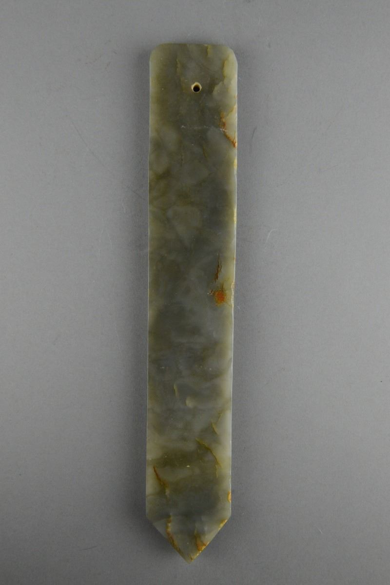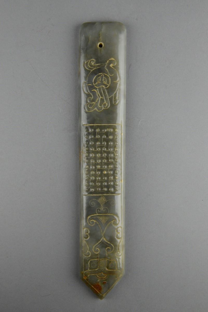 Chinese carved jade tablet, 16th/17th century, of rectangular form, carved with archaic period carvings, the stone of spinach green tones. H: 29 cm, W: 5 cm, 513 grams. Provenance: T. Ng Collection Toronto.