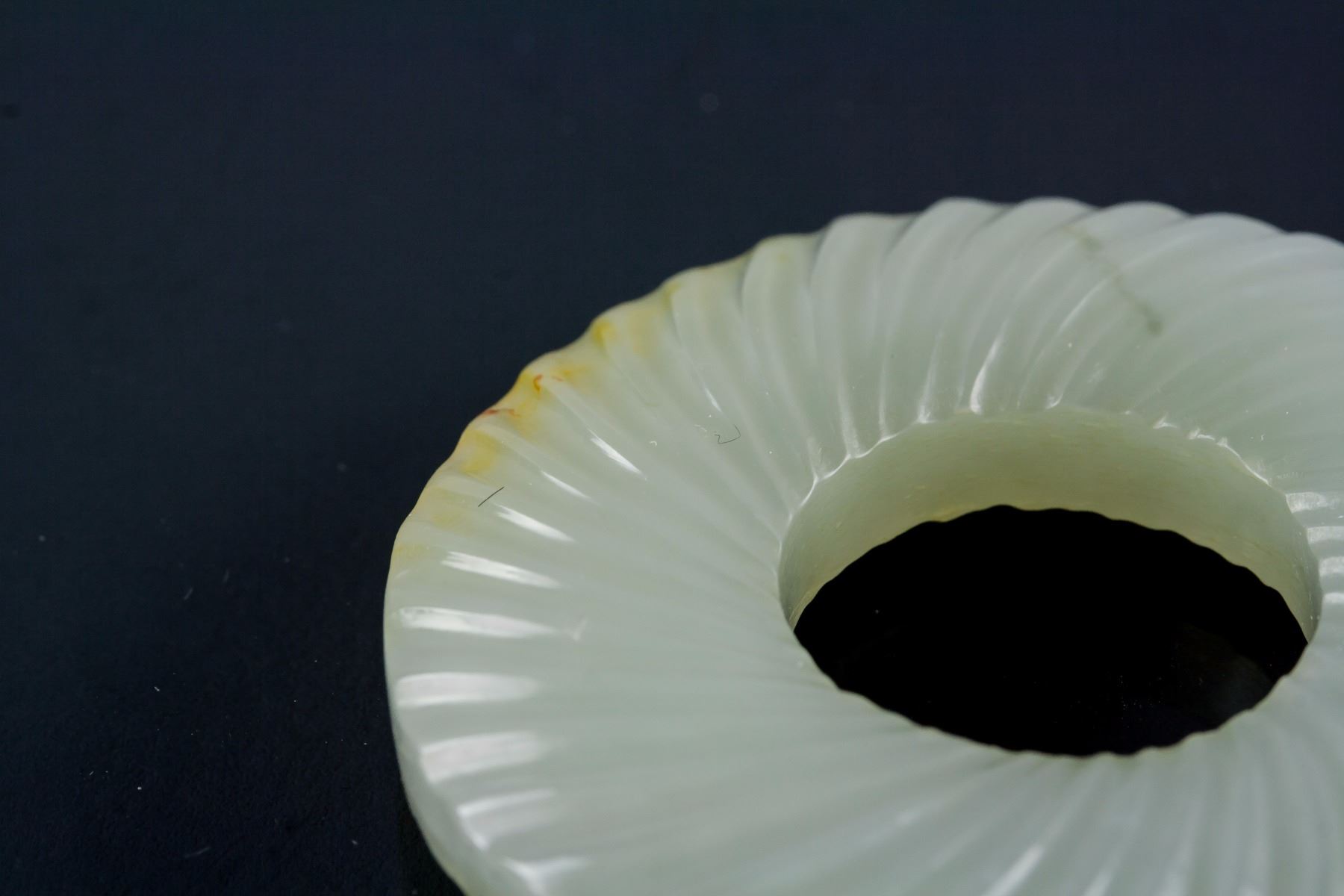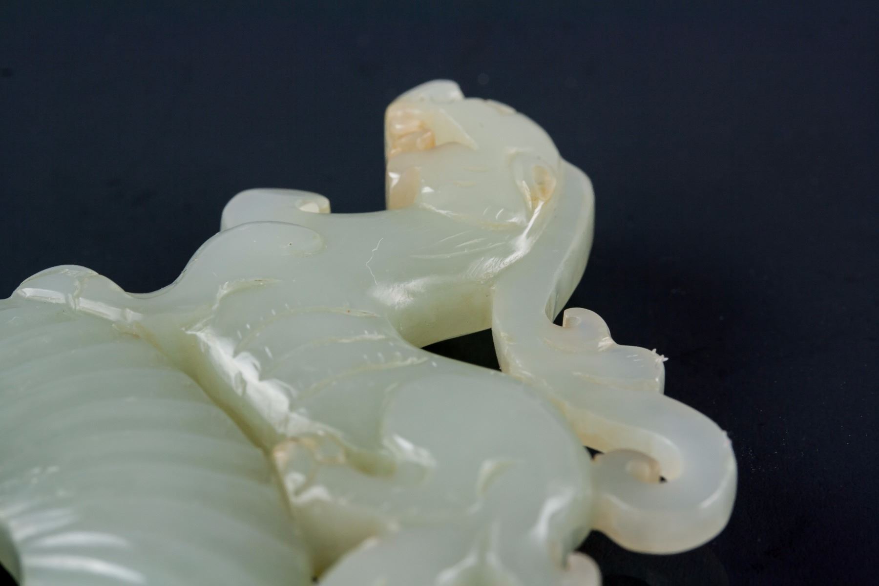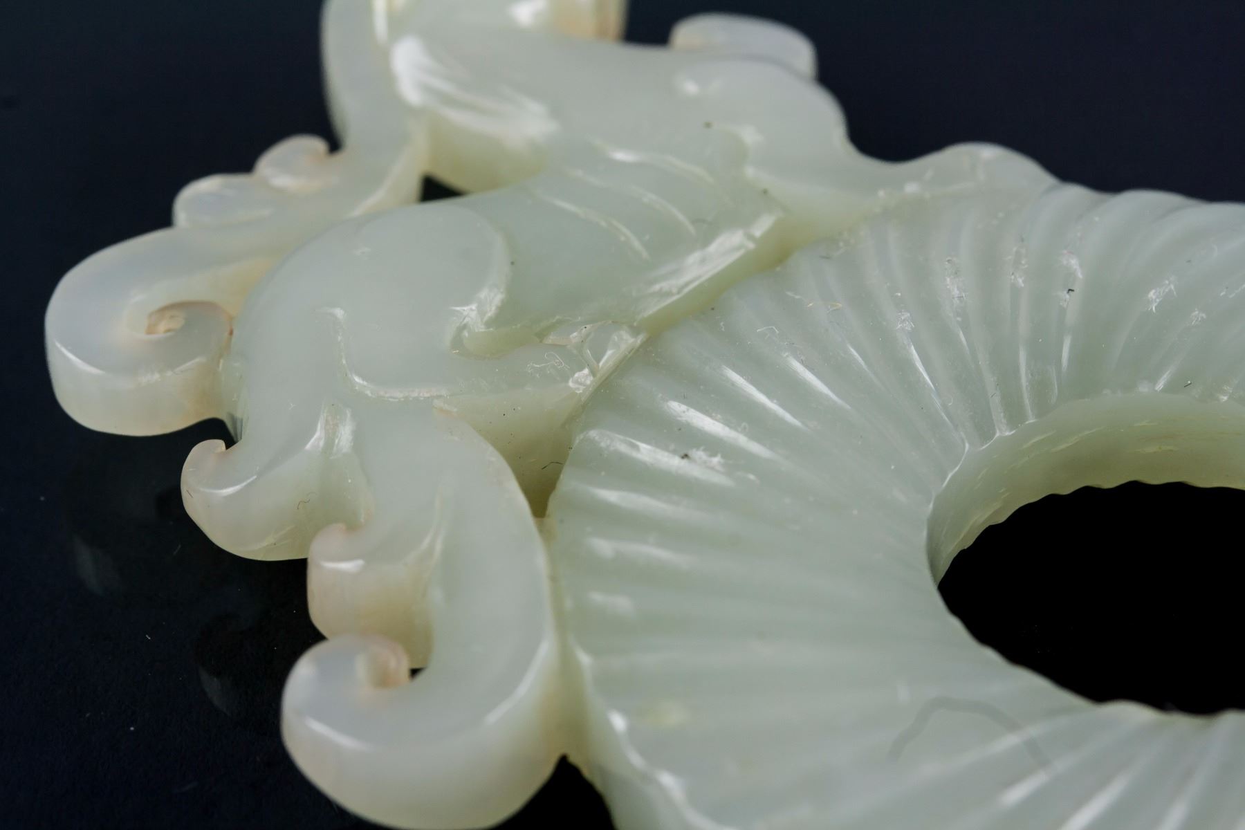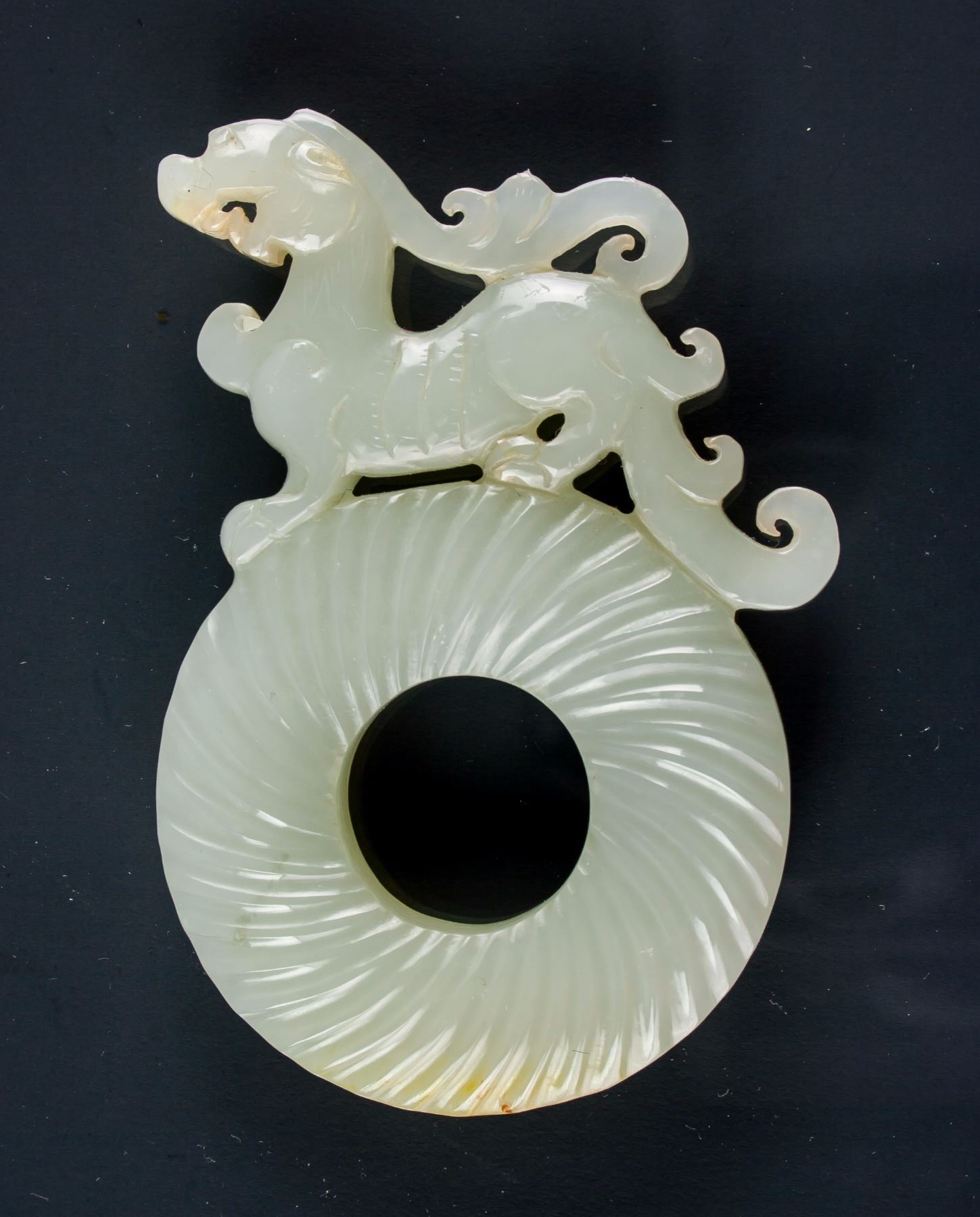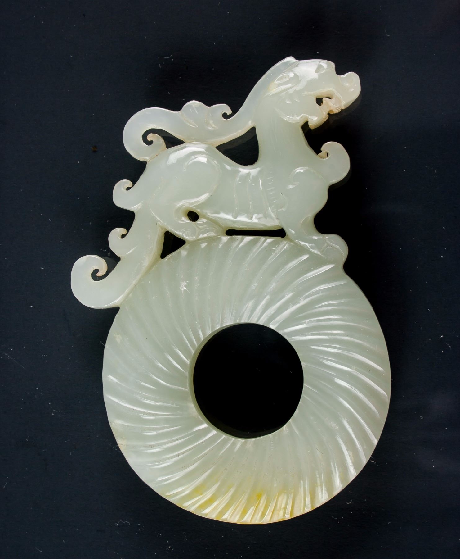 Chinese Hetian white jade carved disk; of a round disk form with a hole in middle; surmounted by a walking Chilong; carved with swirl pattern on surface; of white tone; 17th-18th century; 7.8 cm x 5.5 cm, 46 grams, density: 2.92