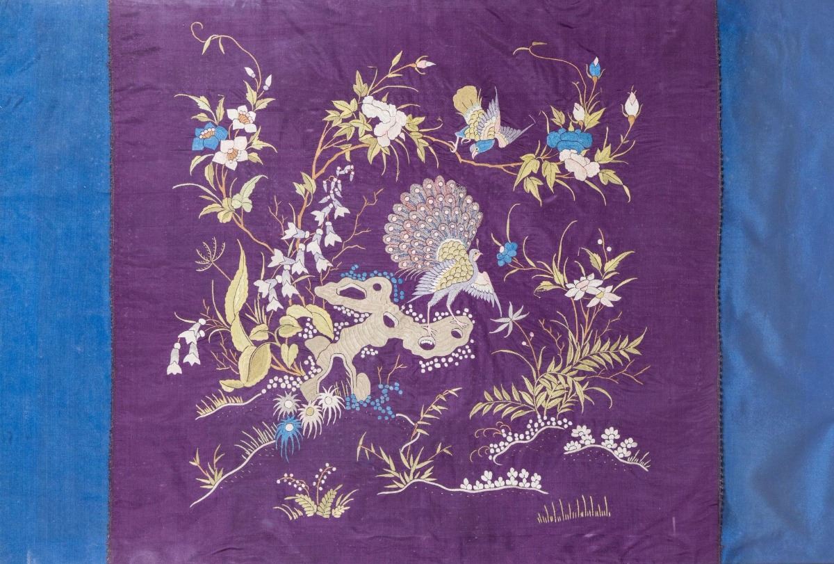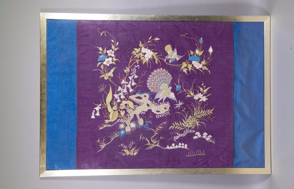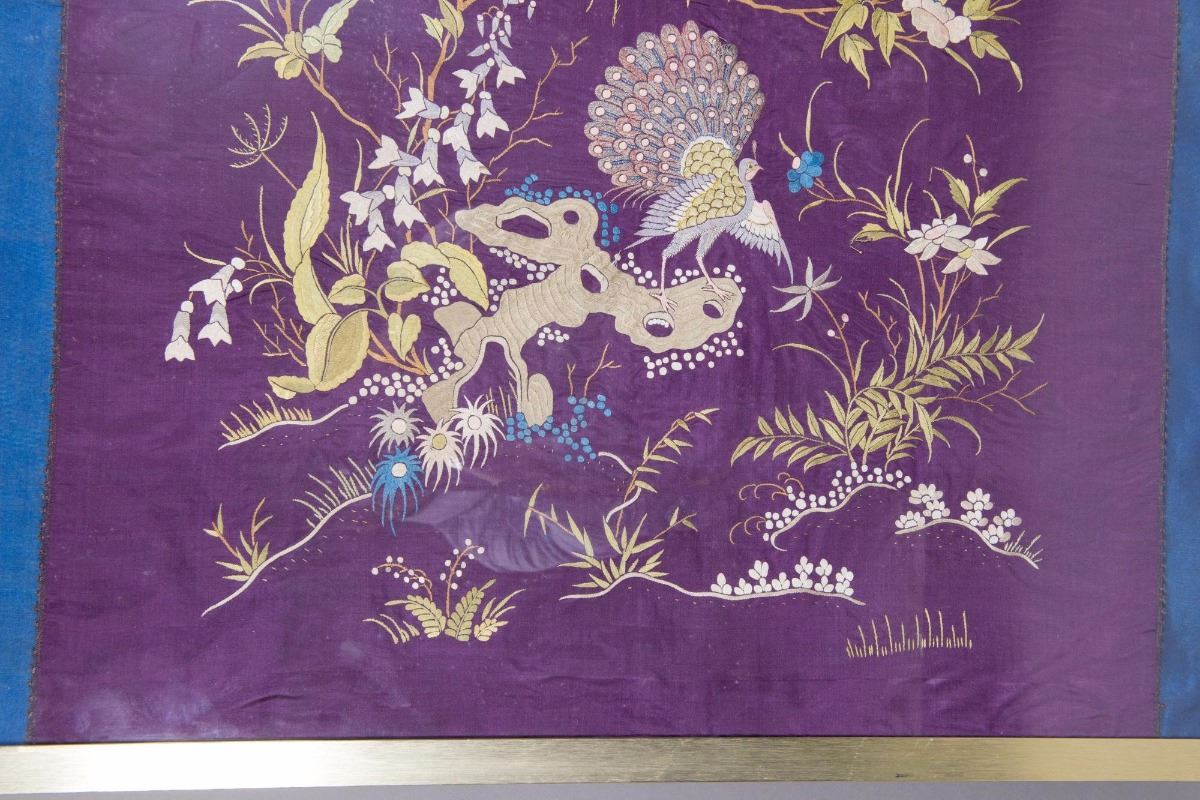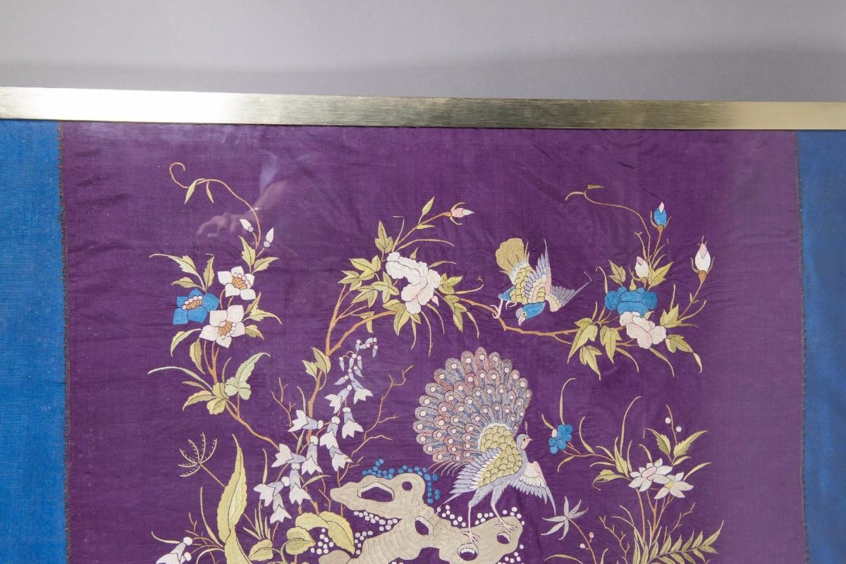Chinese seventeenth/eighteenth silk embroidery panel framed; featuring peacock surrounded by flowers and birds; H: 74 cm, W: 104 cm