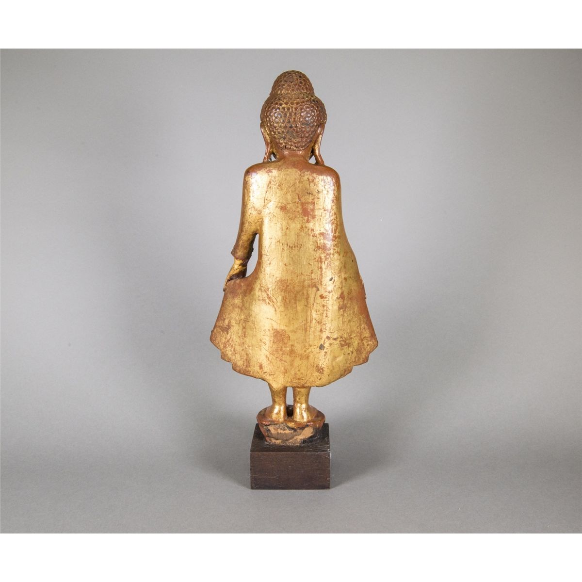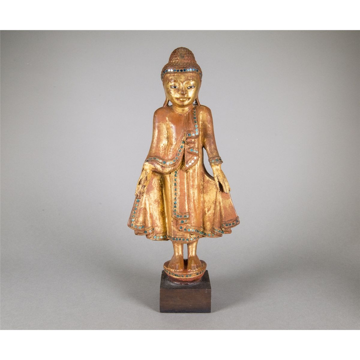Chinese eighteenth/nineteenth century wood carved Guanyin figure; featuring a standing Guanyin gilt figure with peaceful expression; wood stand included; H: 42 cm, W: 17 cm, 736 grams