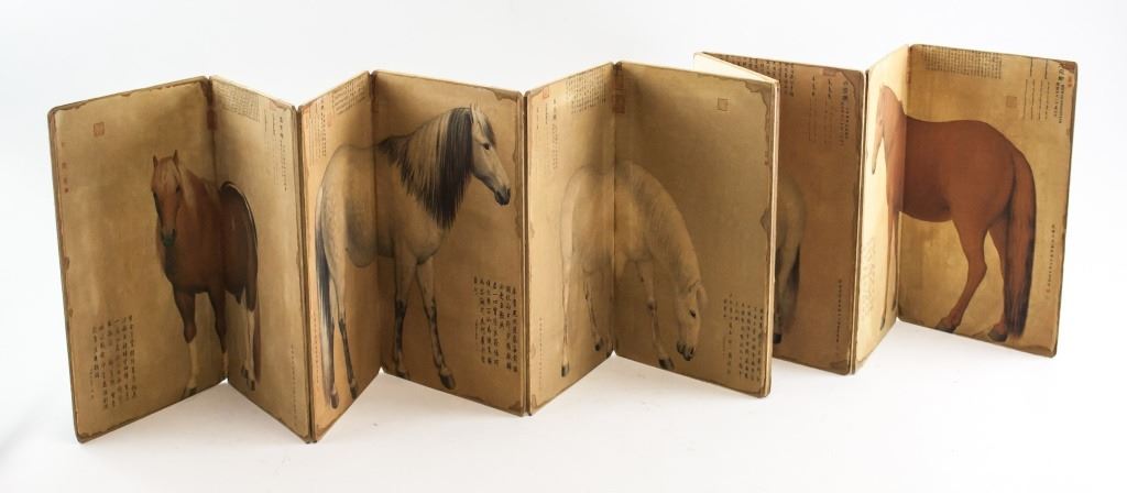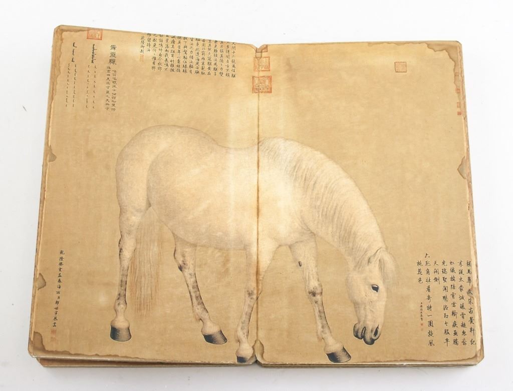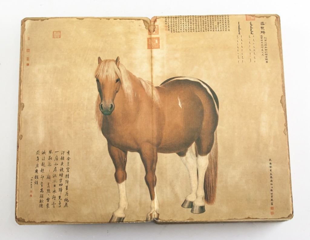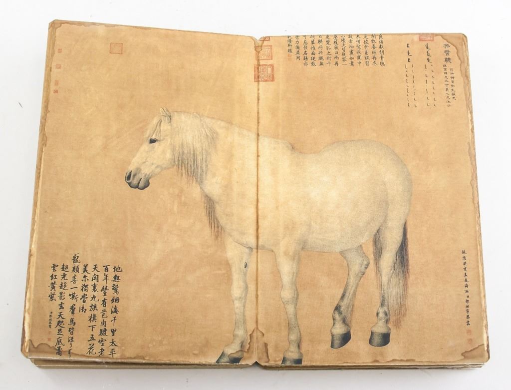 Chinese lithograph print on paper booklet. Featuring portrait of 18 horses. With notes and seals. 28 x 18 cm, 982g .
